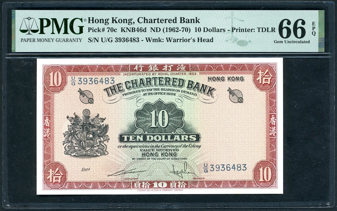 The Chartered Bank, Hong Kong, $10, ND (1962-70), serial number U/G3936483, (Pick 70c), PMG 66EPQ.