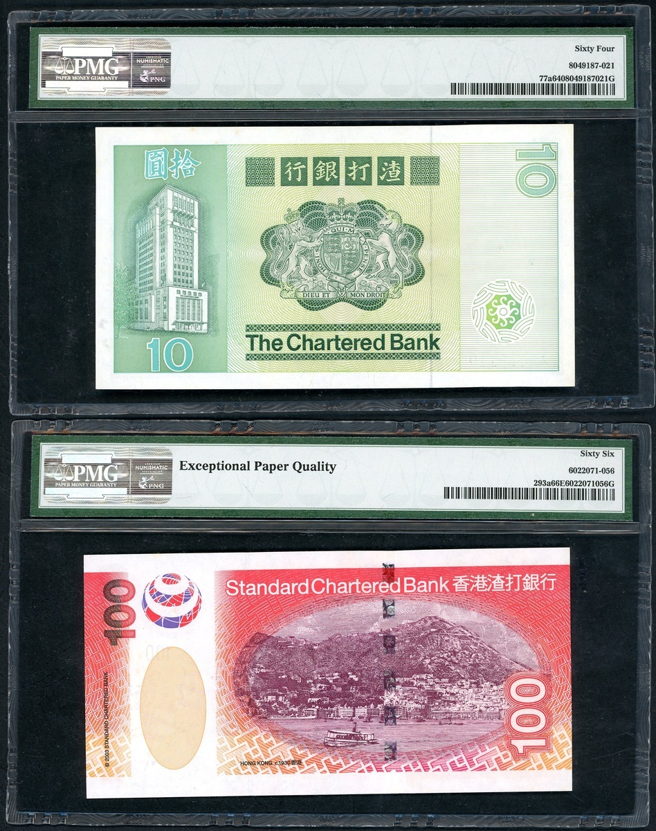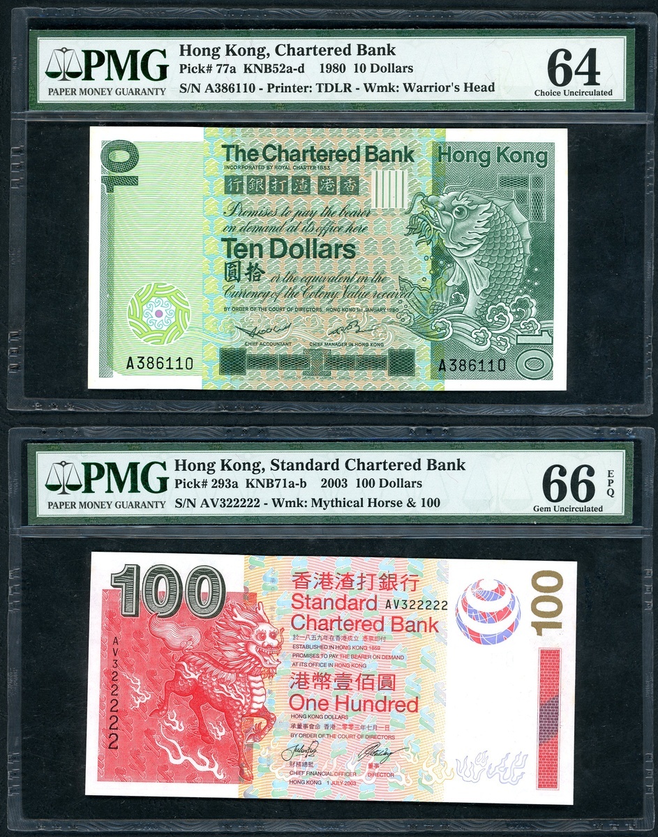 1980及2003年渣打銀行10元及100元,編號A386110及AV322222,PMG分別評64及66EPQ