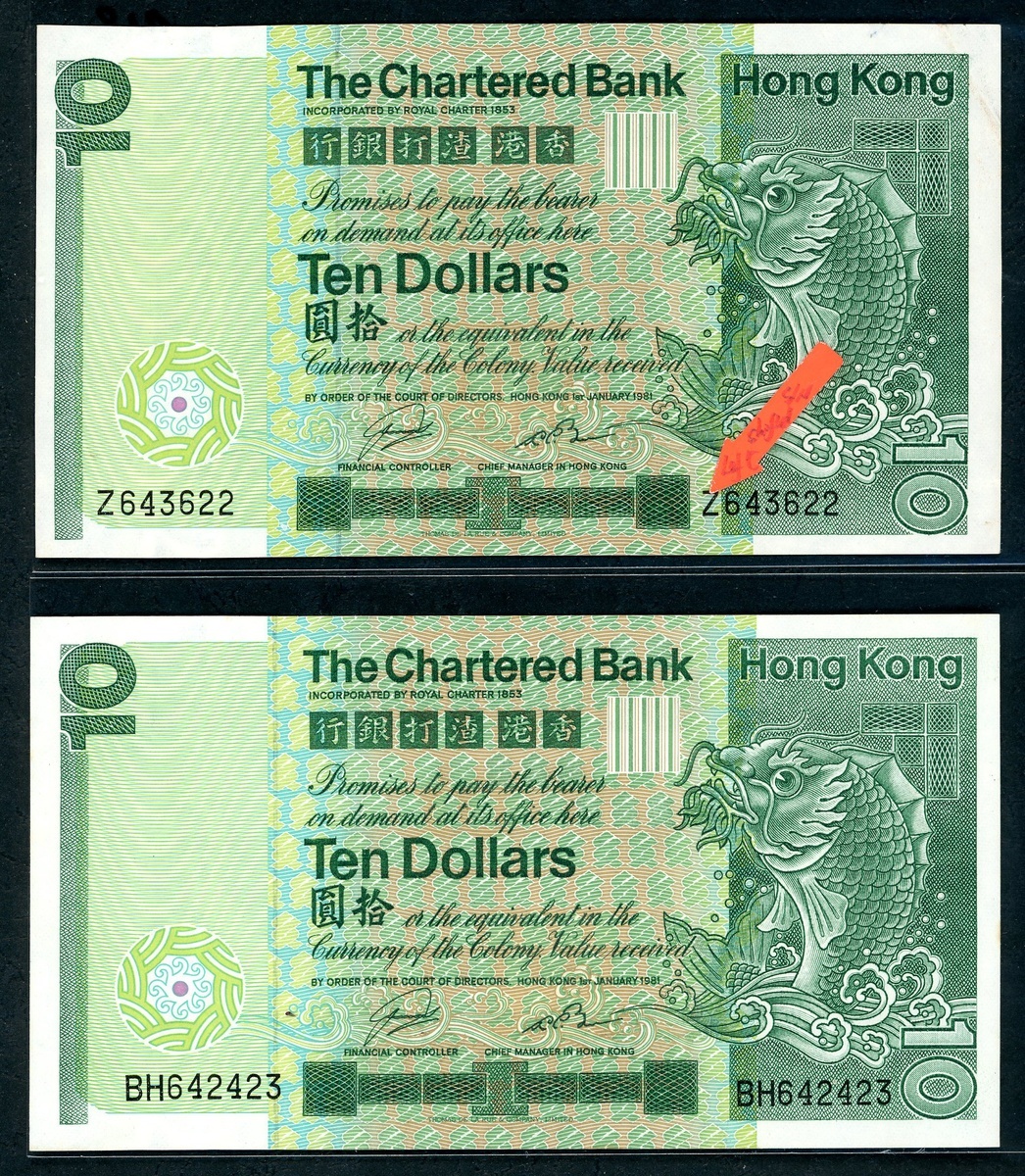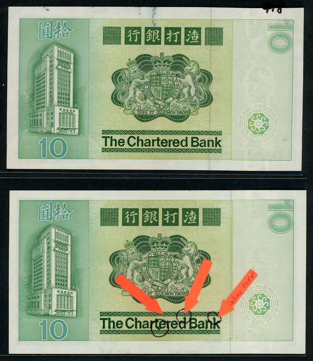 The Chartered Bank Hong Kong, a group of 5x $10, consists of 4 error notes and 1 replacement note, 1.1.1980, A743873, UV inking error,