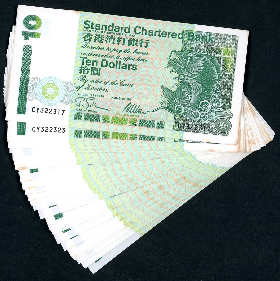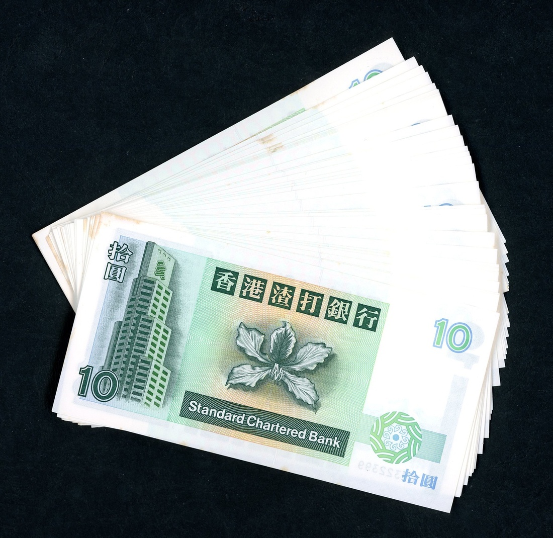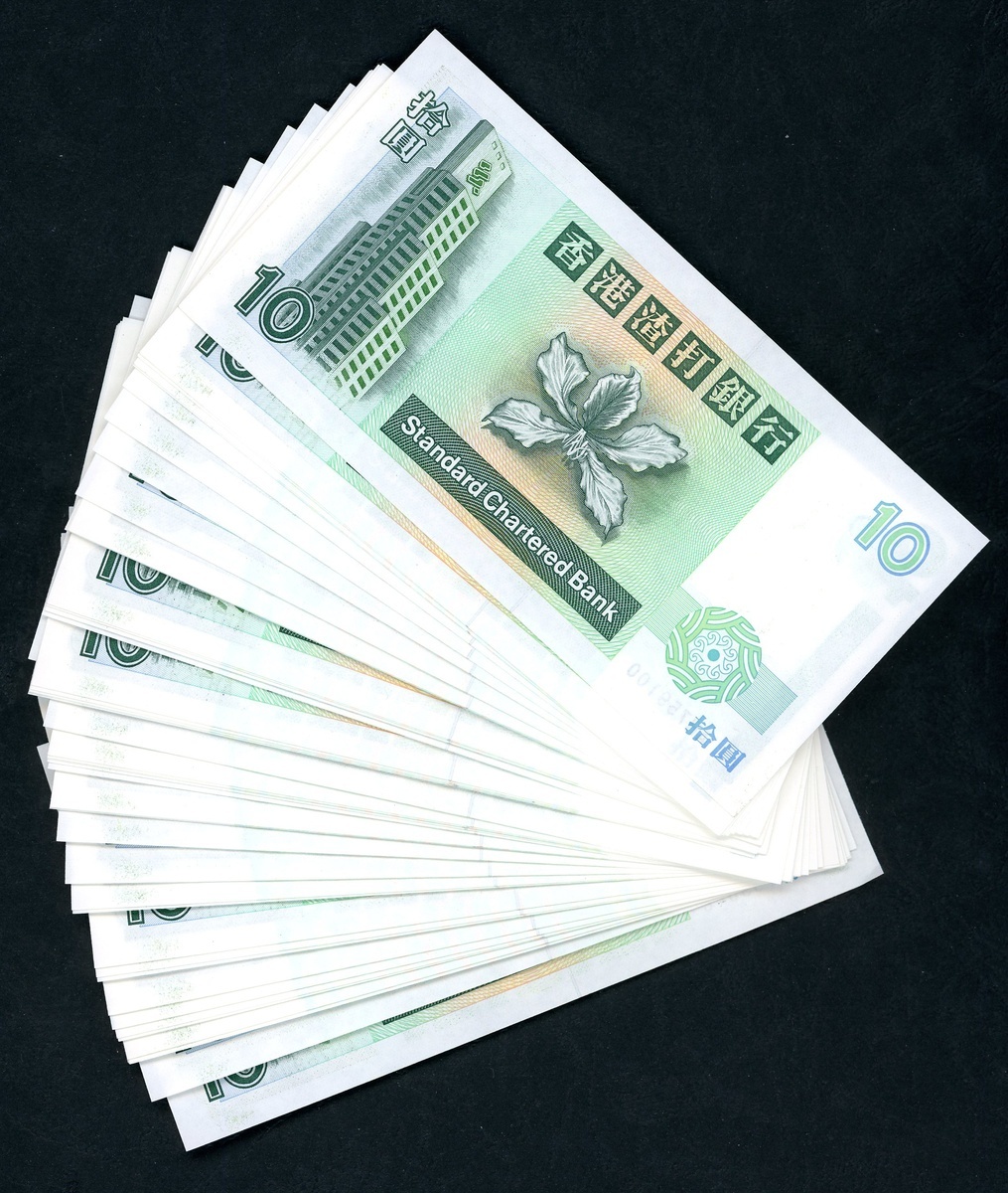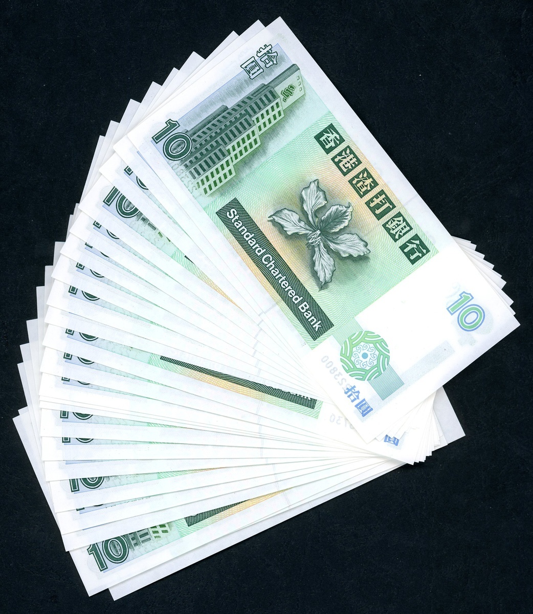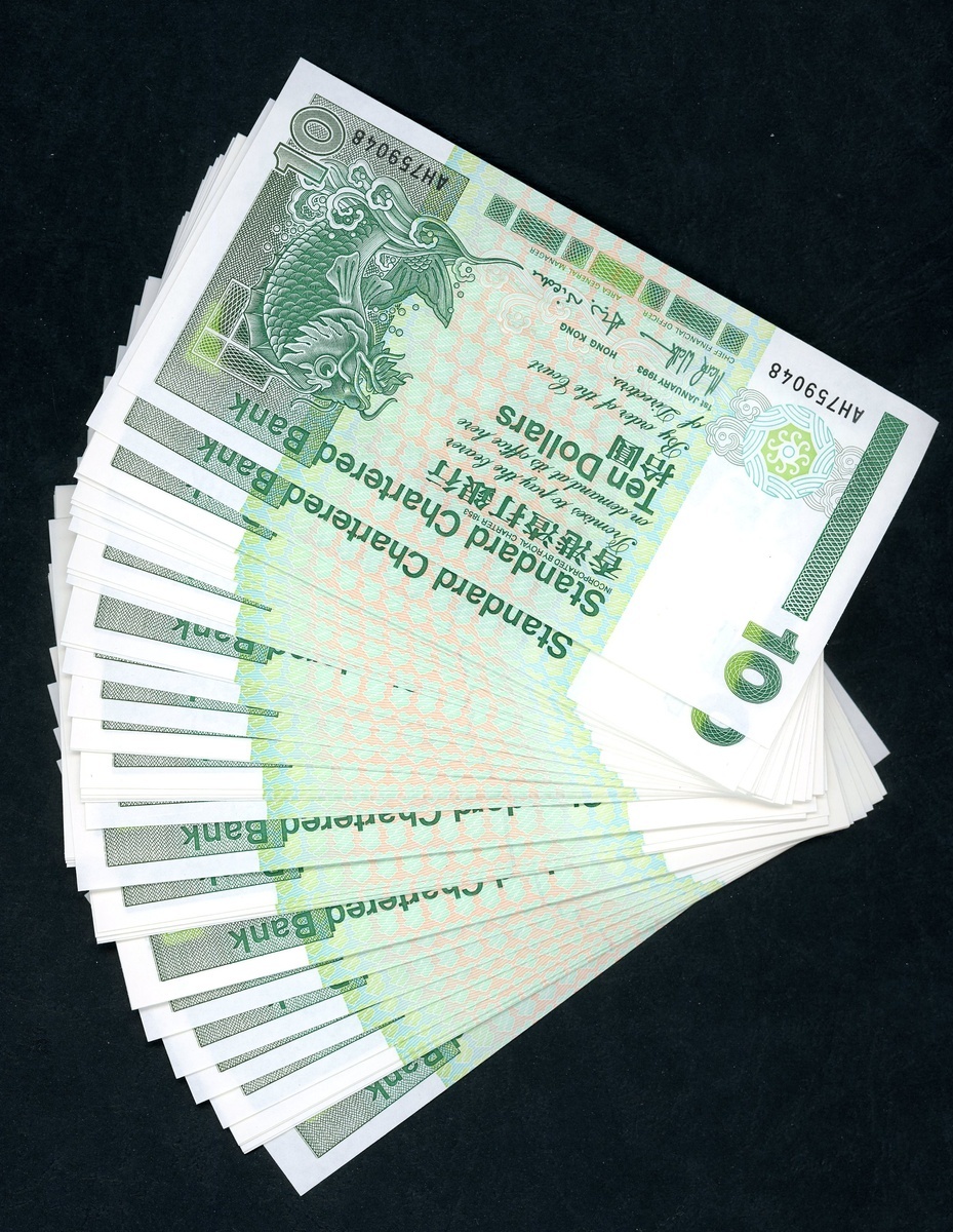 1993及1995年渣打銀行紙鈔10元一組116枚,包括幾組連號L223721-730,738-741,792-800,AH759048-100,CY322317-320,323,333,354-399,UNC品相,邊沿有輕微漬點