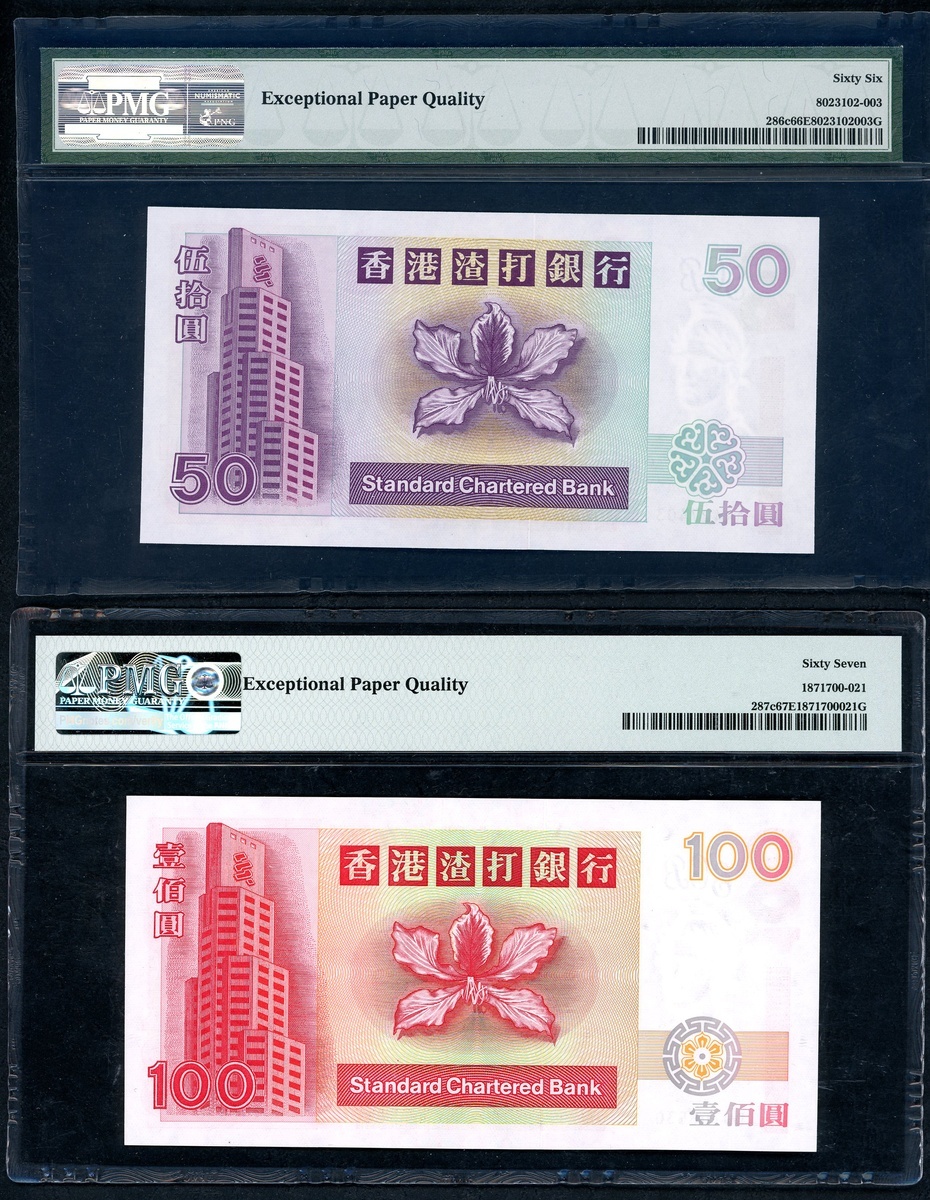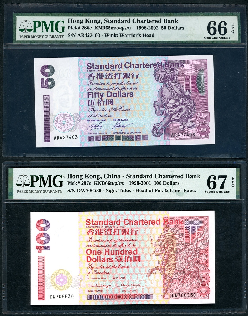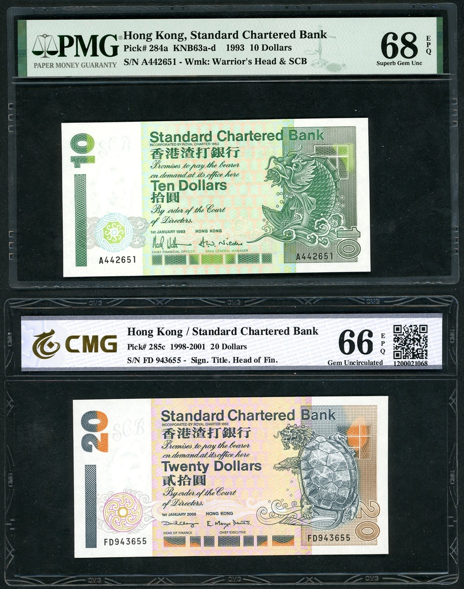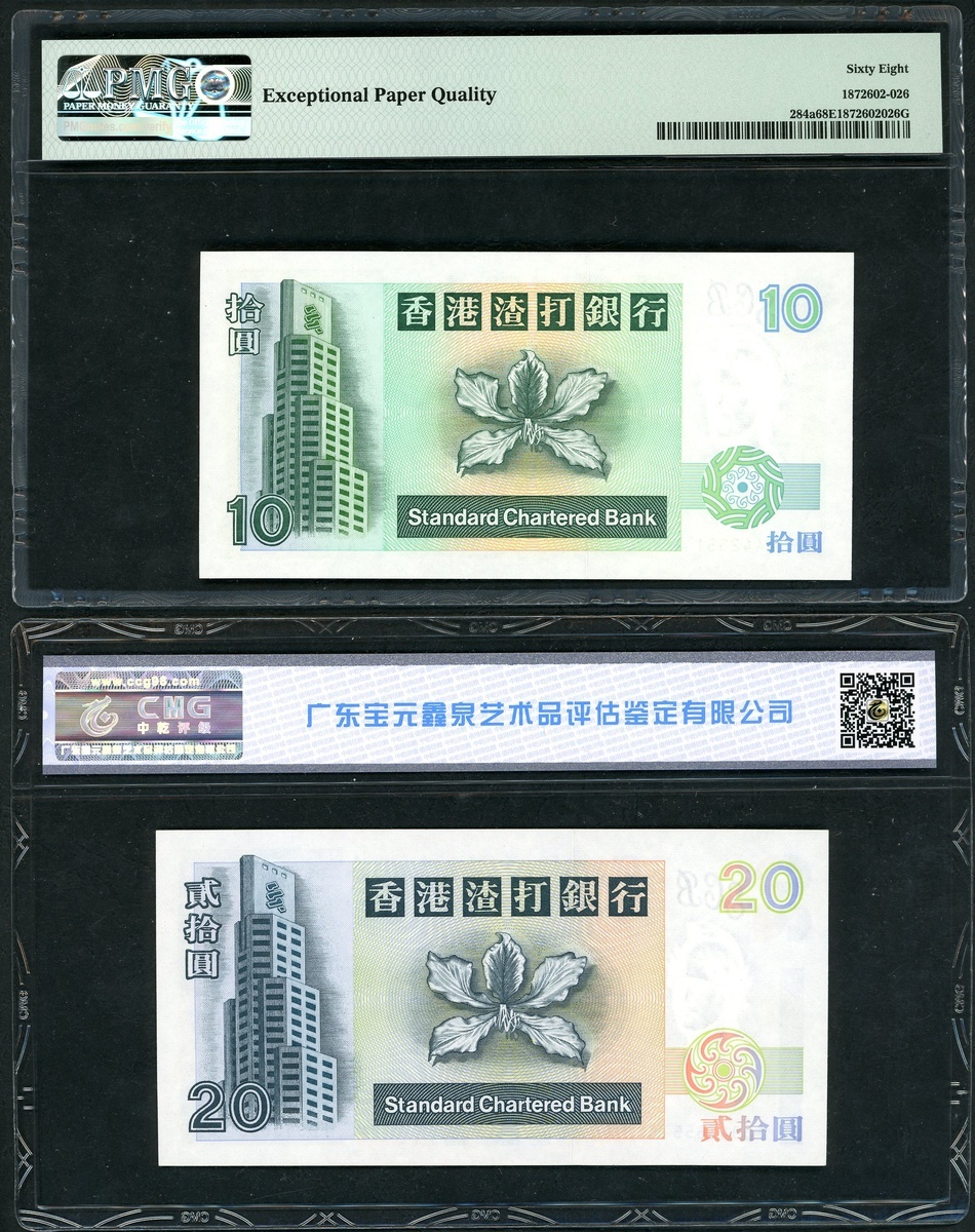 渣打銀行紙鈔一組4枚,包括1993年10元一枚;2000年20元一枚;2002年50元一枚;1998年100元一枚;分別評PMG 68EPQ,CMG 66EPQ,PMG 66EPQ及67EPQ