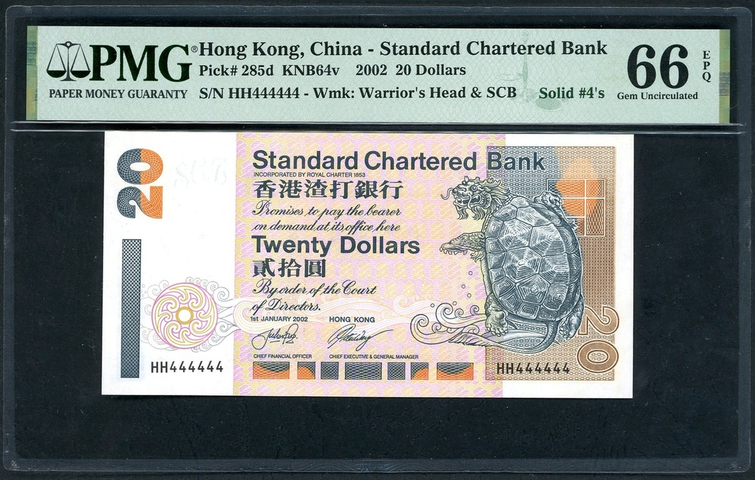 2002年渣打銀行20元,幸運號HH444444,PMG 66EPQ