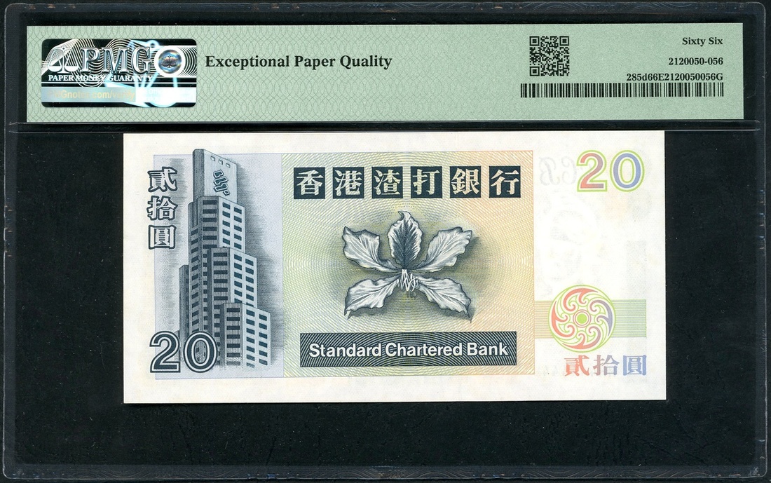 Standard Chartered Bank, $20, 1.1.2002, solid serial number HH444444, (Pick 285d), PMG 66EPQ Gem Uncirculated