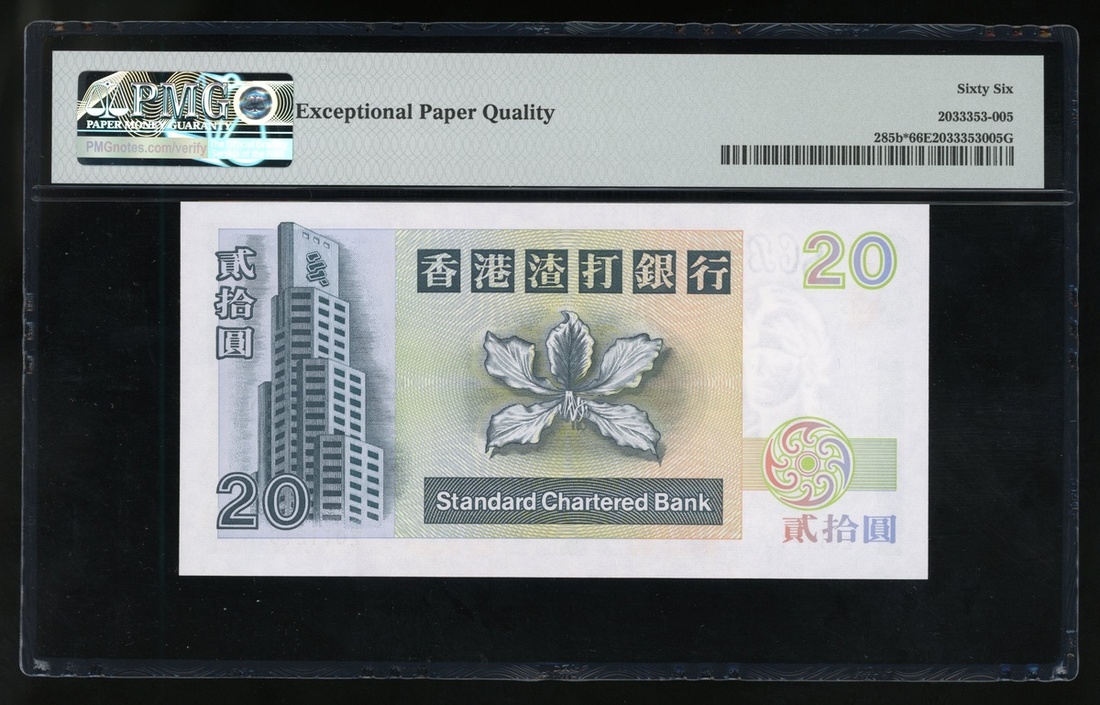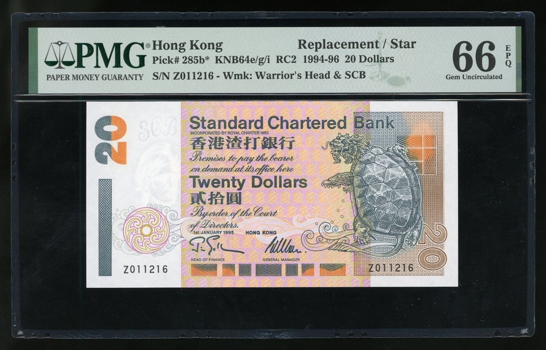 Standard Chartered Bank, Hong Kong, $20, 1.1.1995, replacement serial number Z011216, (Pick 285b*), PMG 66EPQ Gem Uncirculated