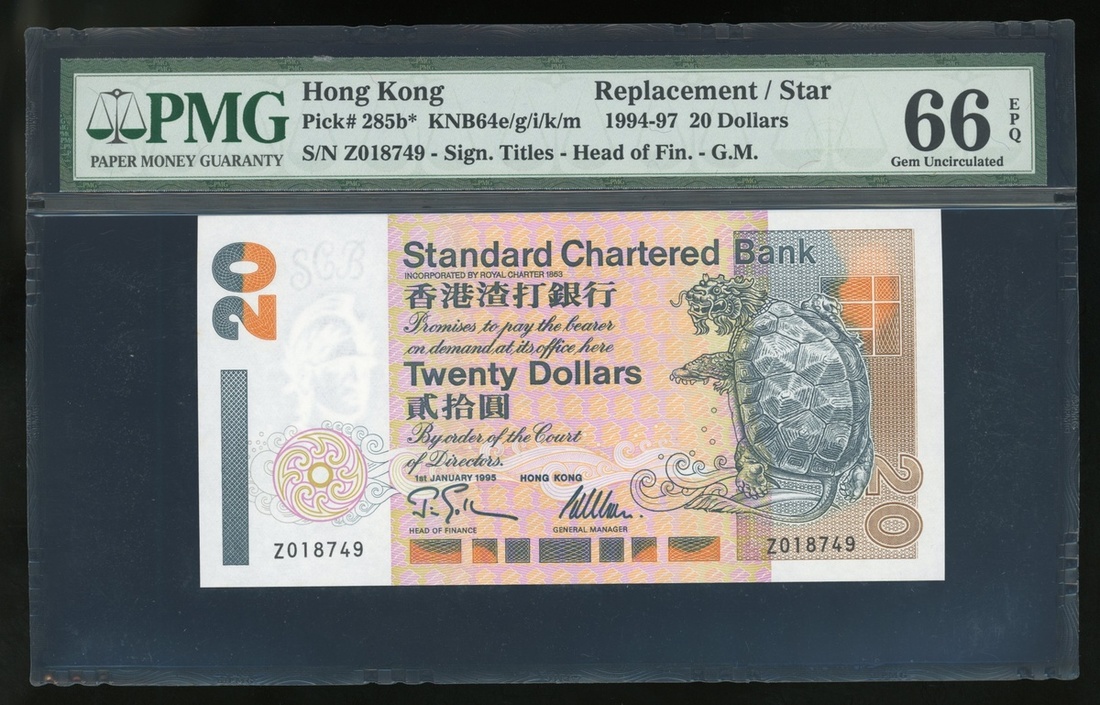 Standard Chartered Bank, Hong Kong, $20, 1.1.1995, replacement serial number Z018749, (Pick 285b*), PMG 66EPQ Gem Uncirculated