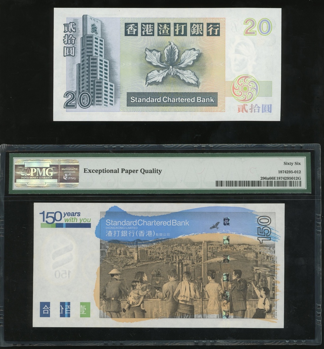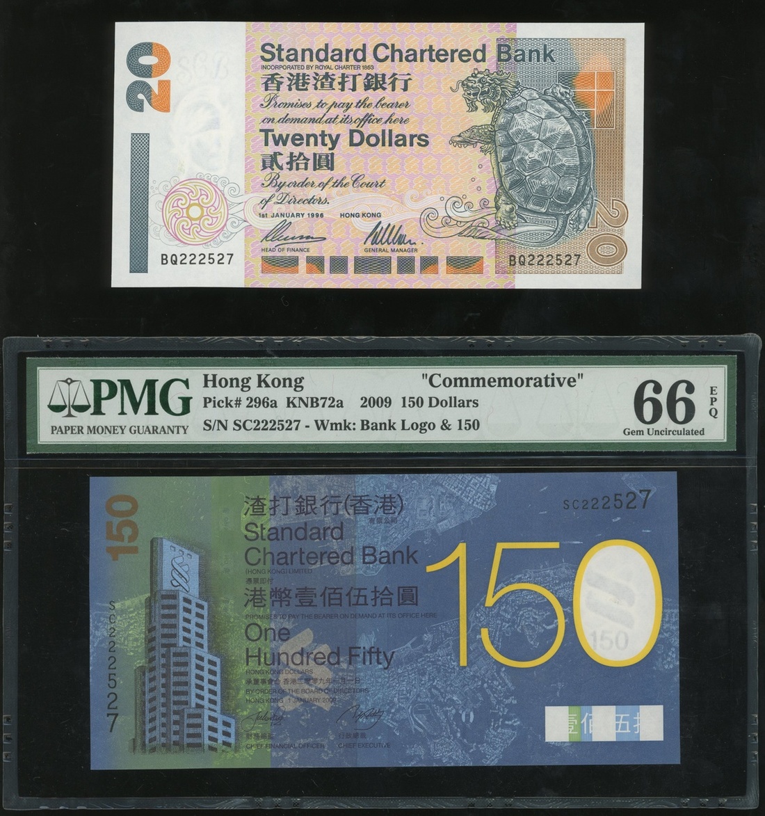 1996及2009年渣打銀行20元和150元,相應編號BQ222527及SC222527,前者UNC品相,後者PMG 66EPQ