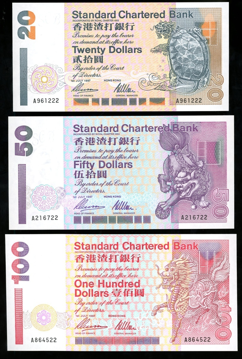 1997年渣打銀行整組5枚,20元,50元,100元,500元及1000元,編號尾數2,UNC品相