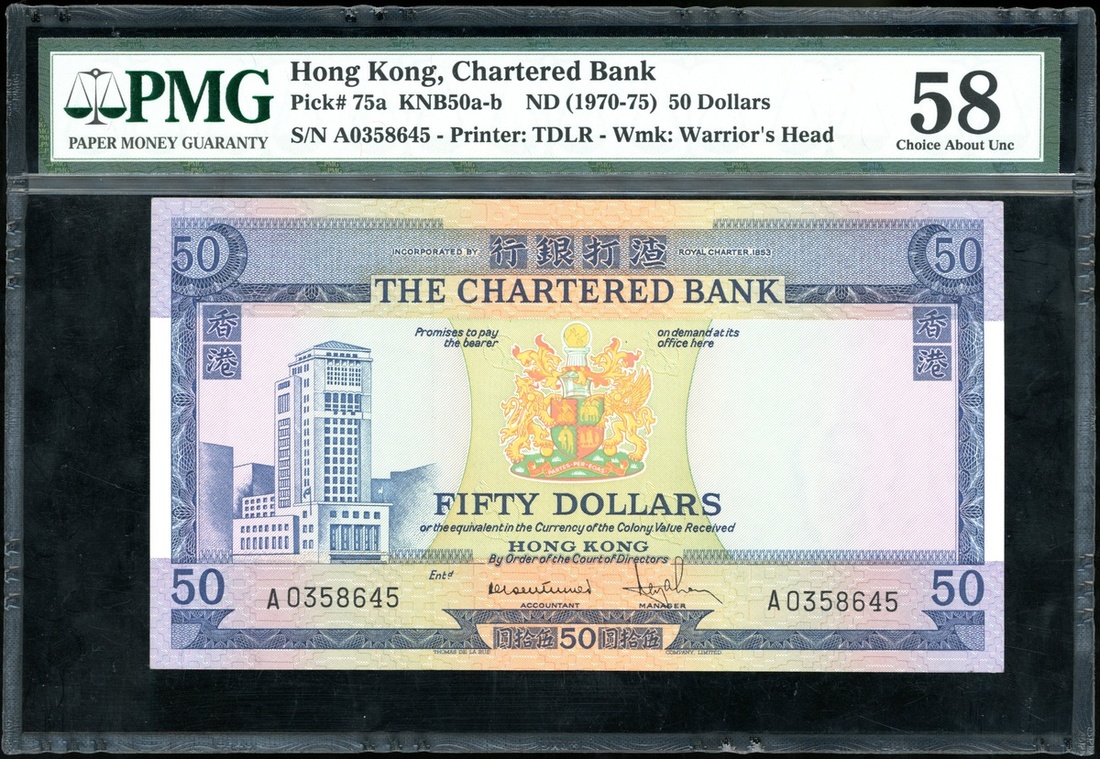 Chartered Bank, Hong Kong, $50, ND (1970-75), serial number A0358645, (Pick 75a), PMG 58 Choice About Unc
