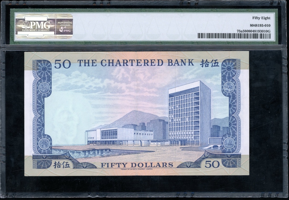 1970至1975年渣打銀行50元,編號A0358645,PMG 58