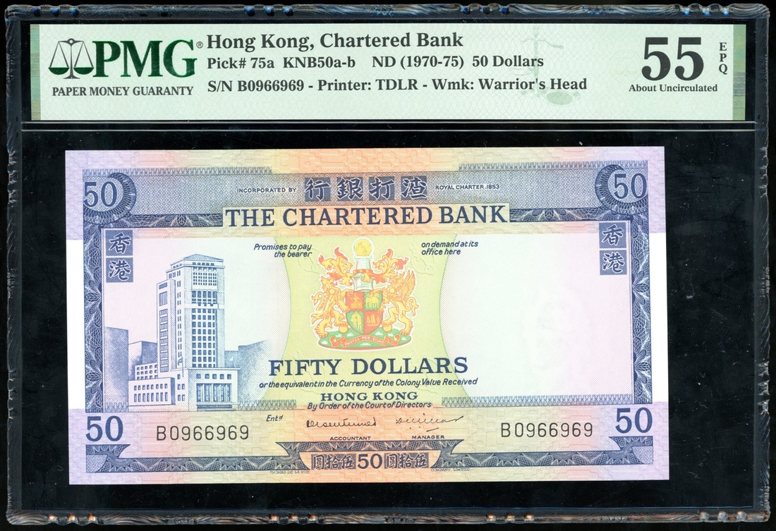 The Chartered Bank, Hong Kong, $50, ND(1970-75), serial number B0966969, (Pick 75a), PMG 55EPQ.