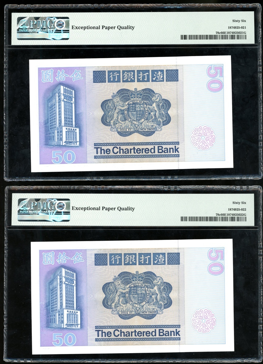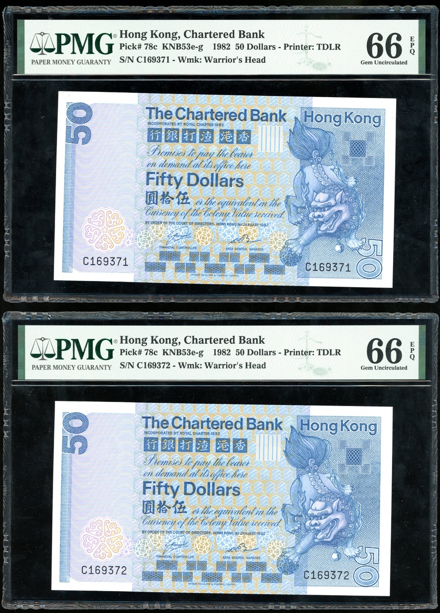 The Chartered Bank, Hong Kong, consecutive pair of $50, 1.1.1982, serial numbers C169371-372, (Pick 78c), both graded PMG 66EPQ Gem Uncirculated (2).