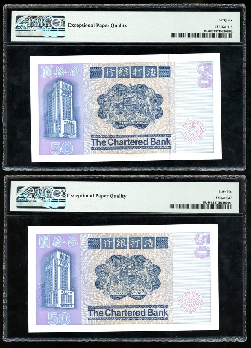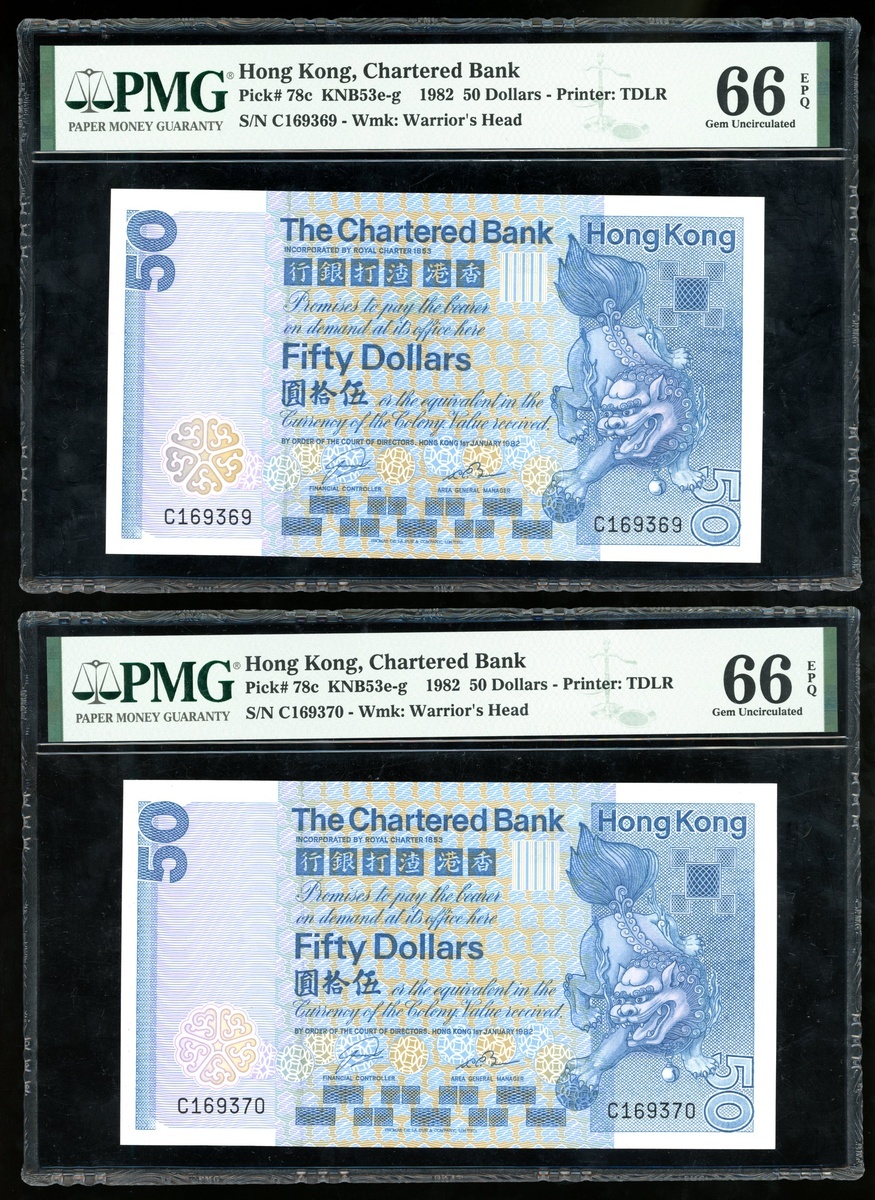 The Chartered Bank, Hong Kong, consecutive pair of $50, 1.1.1982, serial numbers C169369-370, (Pick 78c), both graded PMG 66EPQ Gem Uncirculated (2).