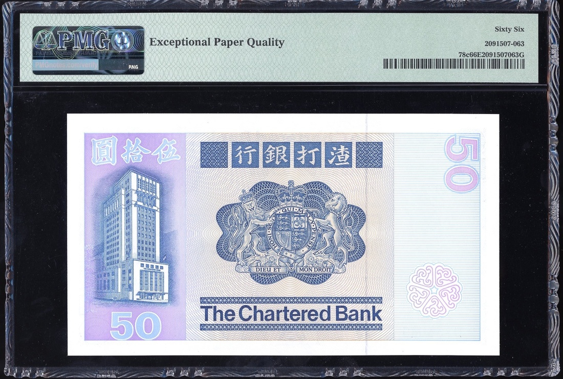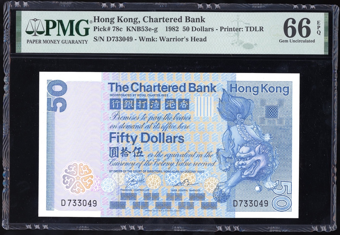 The Chartered Bank, Hong Kong, $50, 1.1.1982, serial number D733049, (Pick 78c), PMG 66EPQ Gem Uncirculated.