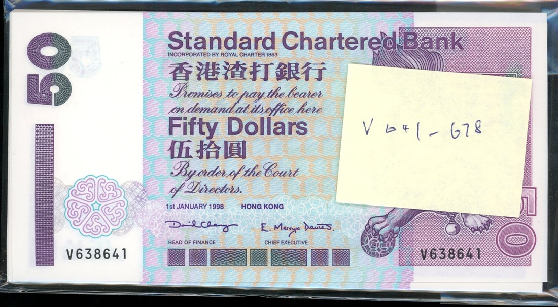 1998年渣打銀行50元連號38枚,編號V638641-678,包括V638666,UNC品相