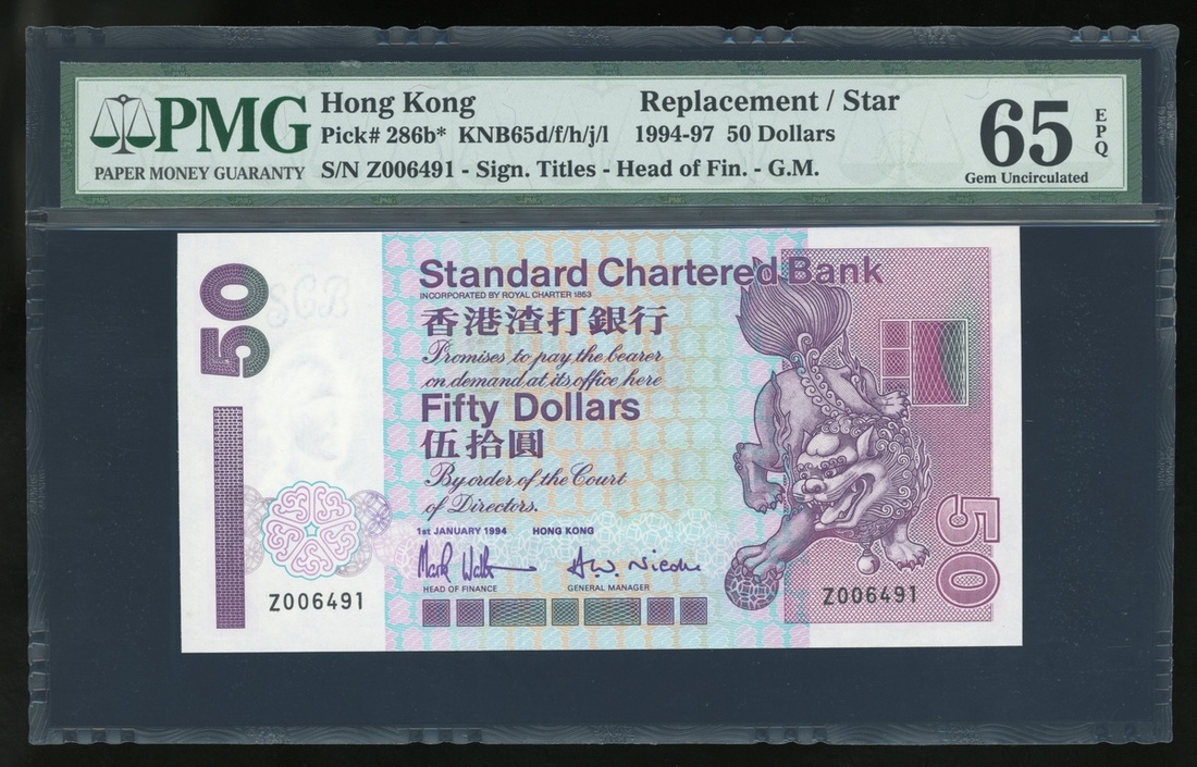 1994年渣打銀行50元,補號Z006491,PMG 65EPQ