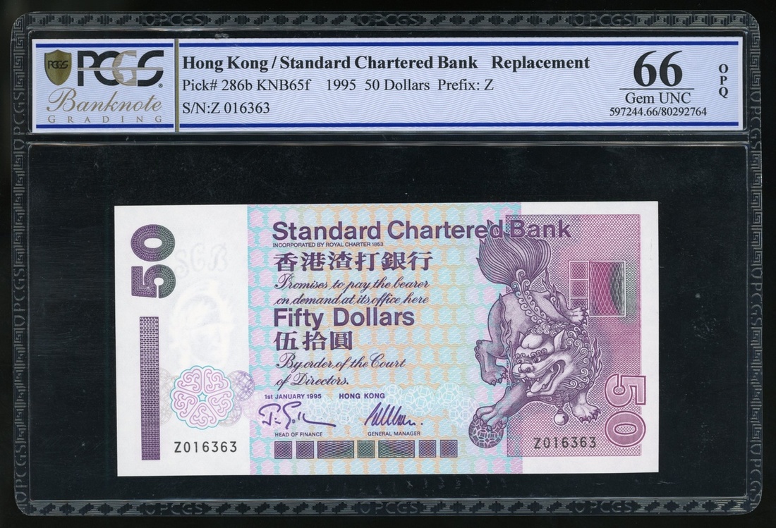 Standard Chartered Bank, Hong Kong, $50, 1.1.1995, replacement serial number Z016363, (Pick 286b*), PCGS 66OPQ Gem Uncirculated