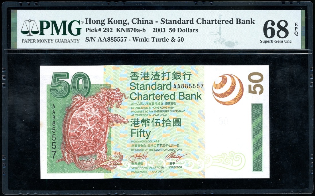 Standard Chartered Bank, Hong Kong, $50, 1.7.2003, first prefix serial number AA885557, (Pick 292), PMG 68EPQ Superb Gem Uncirculated