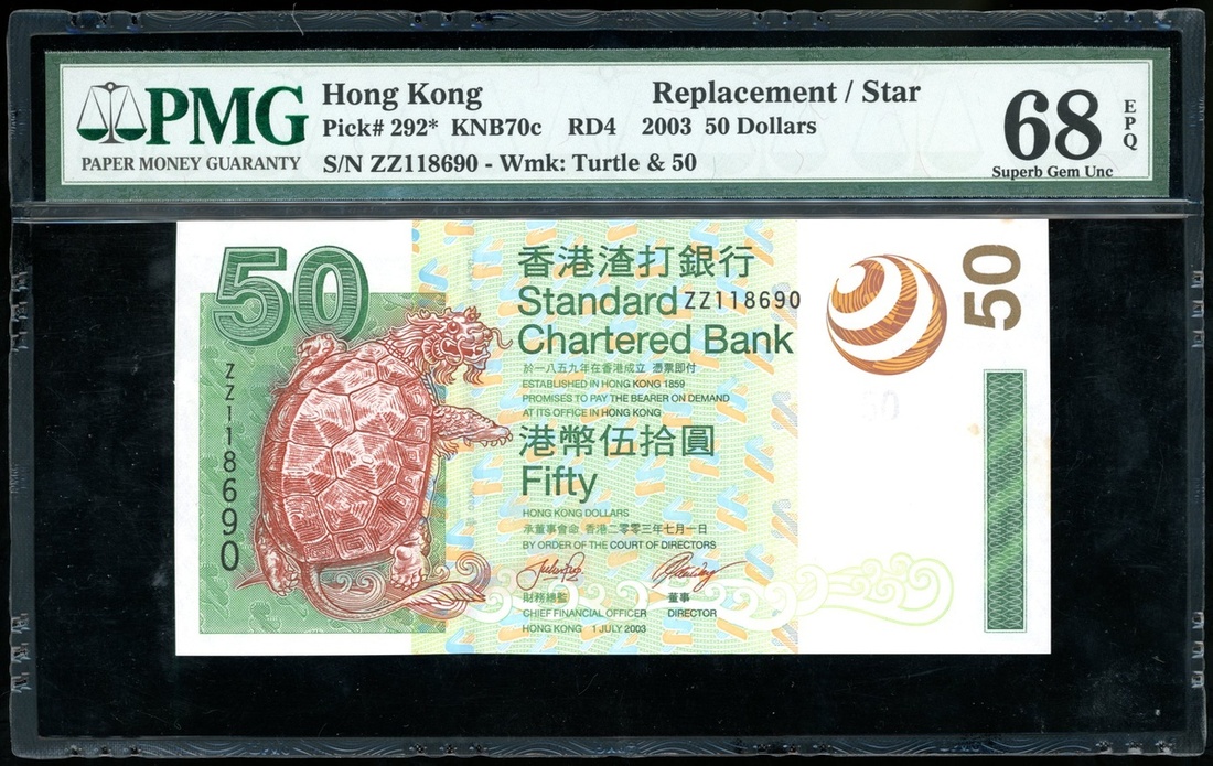 Standard Chartered Bank, Hong Kong, $50, 1.7.2003, replacement serial number ZZ118690, (Pick 292*), PMG 68EPQ Superb Gem Uncirculated
