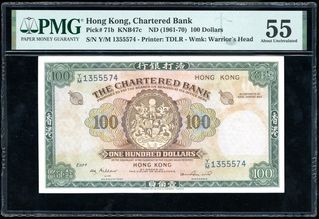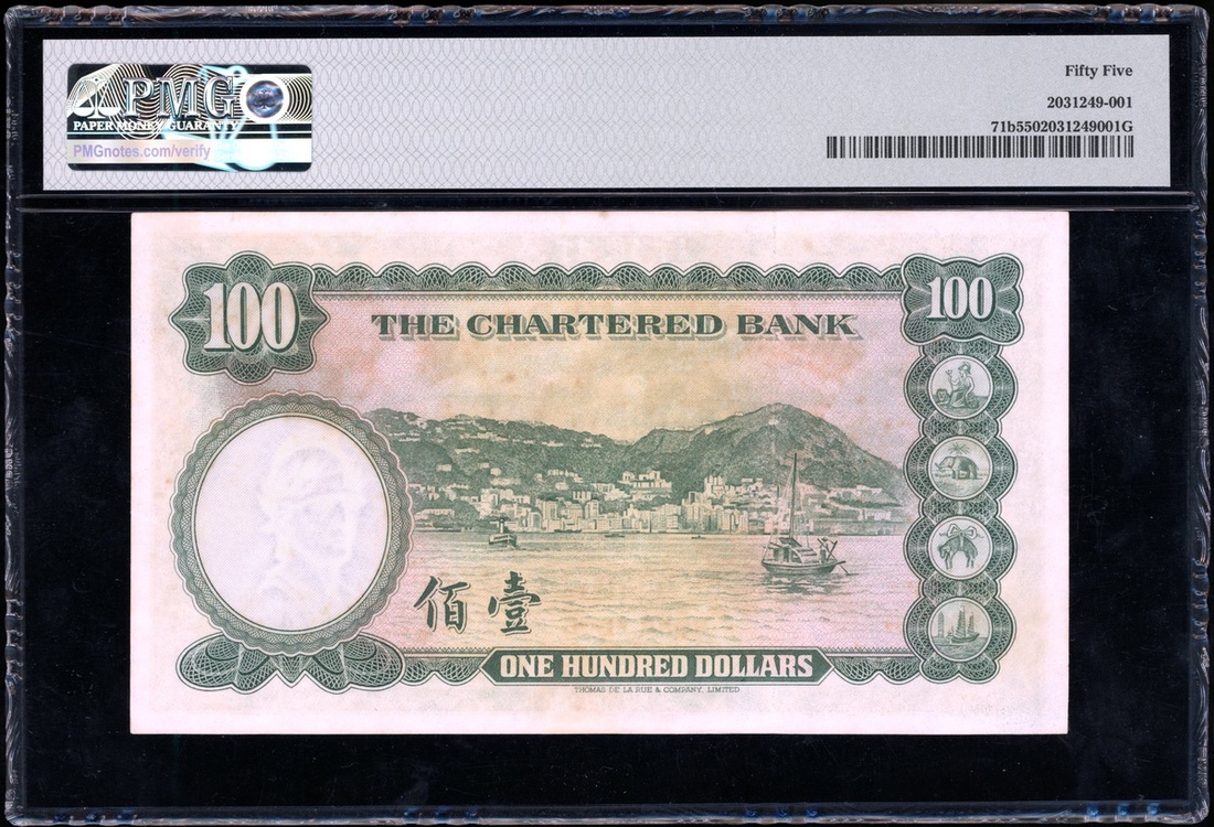 The Chartered Bank, $100, ND(1961-70), serial number Y/M 1355574, (Pick 71b), PMG 55, about uncirculated.