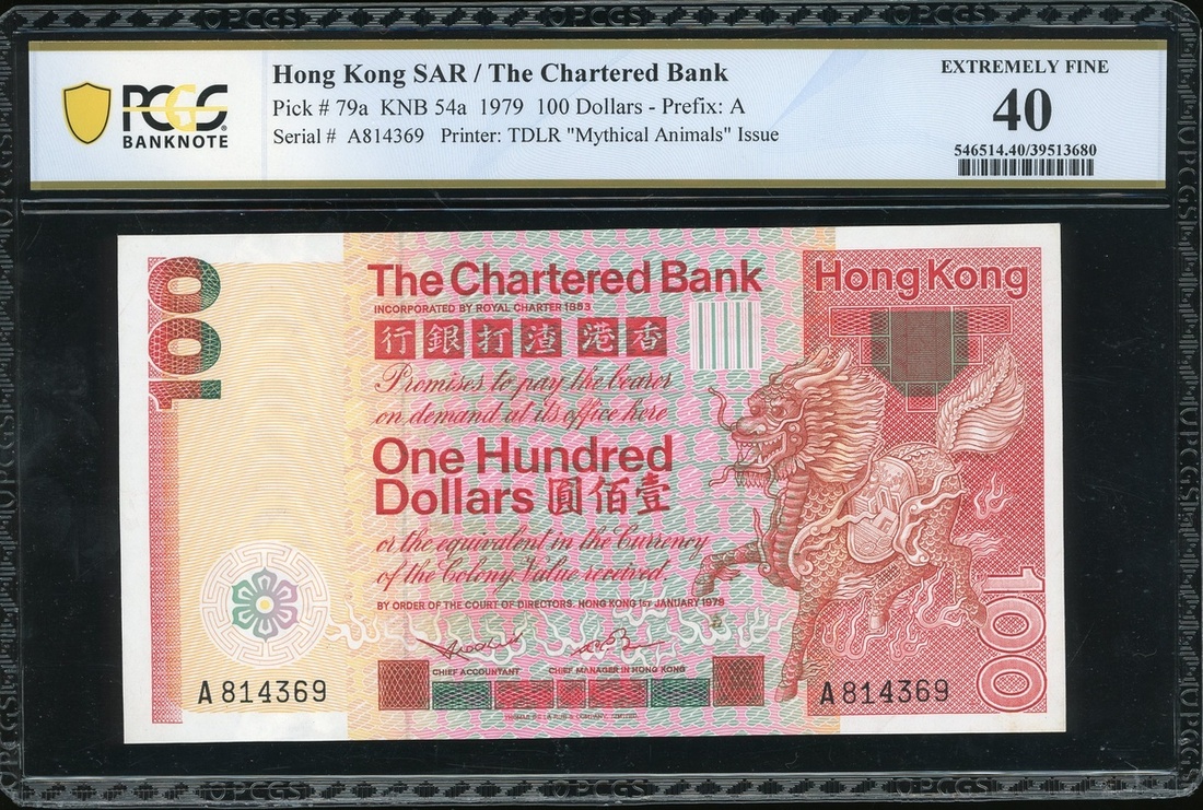 The Chartered Bank, $100, 1.1.1979, first prefix serial number A816369, (Pick 79a), PCGS Banknote 40 Extremely Fine.