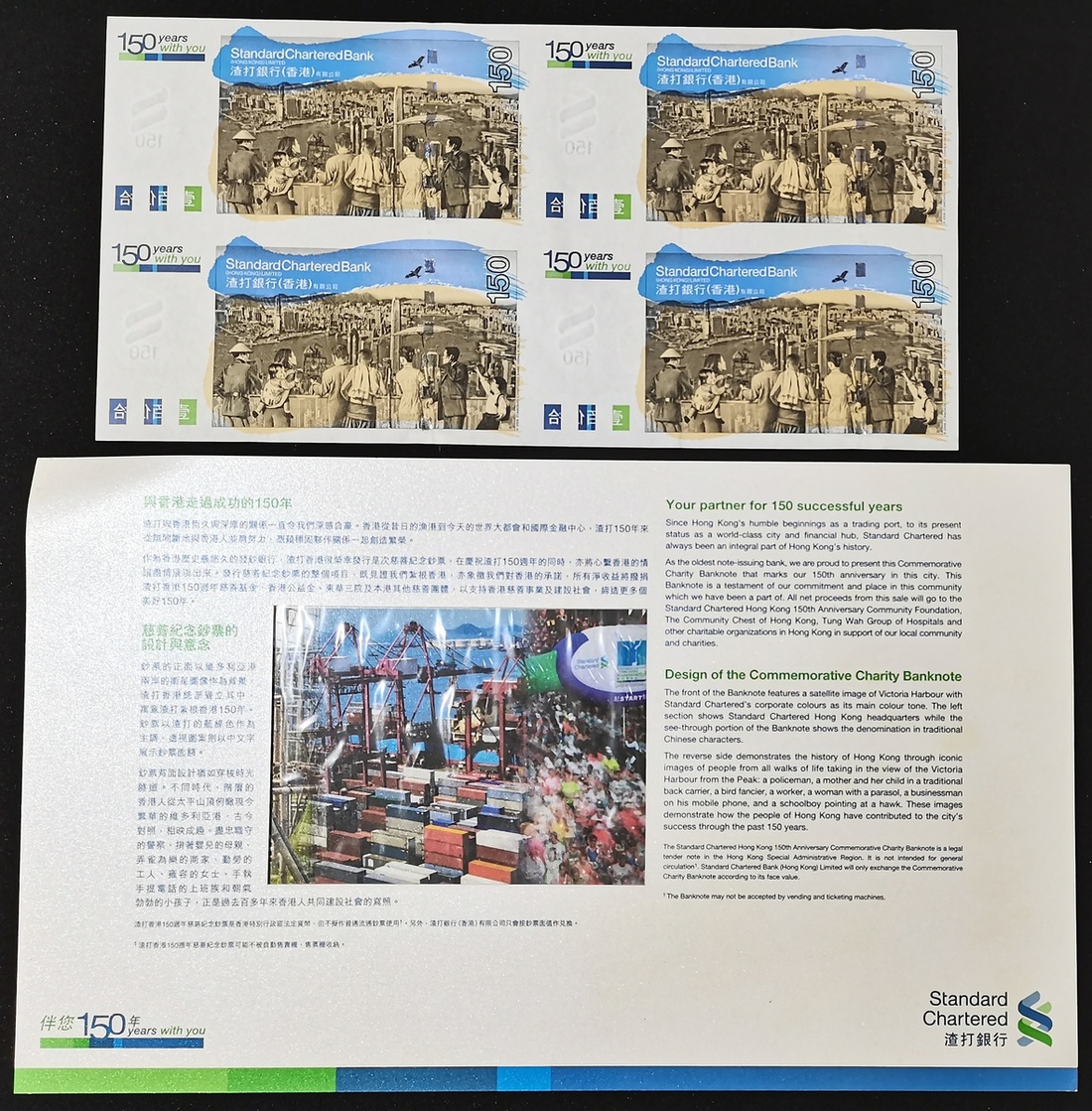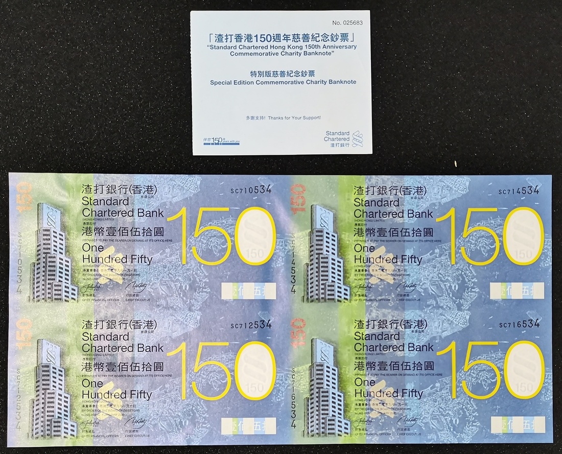 Standard Chartered Bank, a uncut sheet of 4 x $150, 1.1.2009, serial numbers SC 710534, 712534, 714534, 716543, issued for the Bank's 150th Anniversary,
