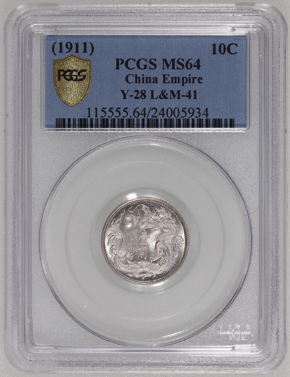 Qing Dynasty, China, silver 10 cent, Year 3 of Xuan Tong (1911), 'Da Qing Yin Bi', Central mint, (LM-41, Y-28), PCGS MS64, cert. #24005934. undoubtedly one of the better representative of this type with velvety sheen across the fields. A surprisingly difficult type in high grade
