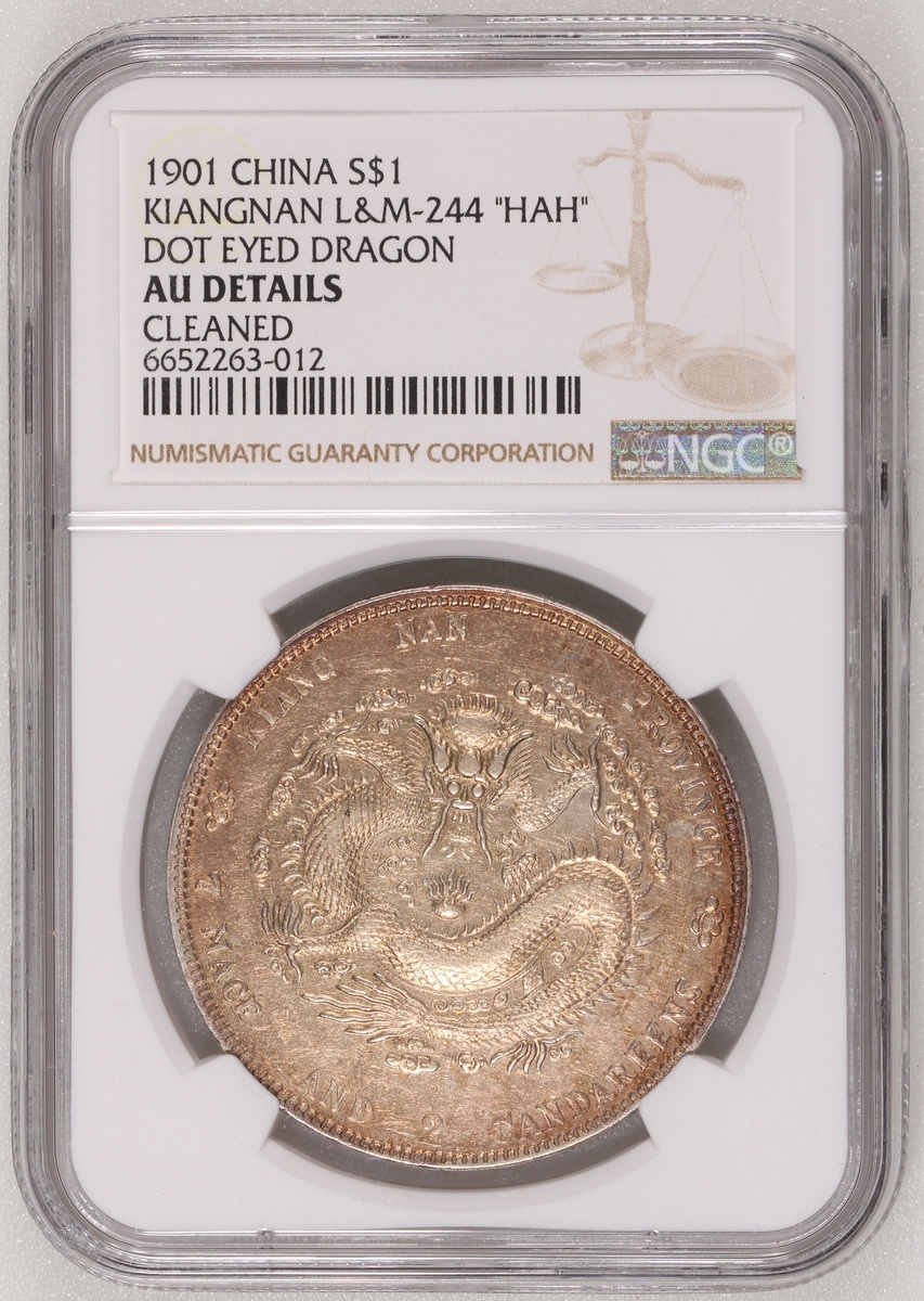 Kiangnan Province, Qing Dynasty, China, silver dollar, Year 27 of Guangxu (1901), thick 'HAH' on reverse variety, (LM-244), NGC AU Details (Cleaned), cert. #6652263-012. Even honey brown toning on obverse, reverse is similar but more mottled