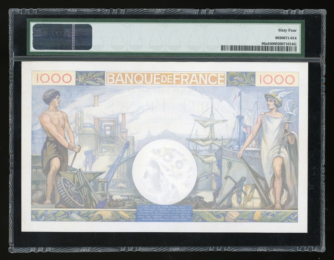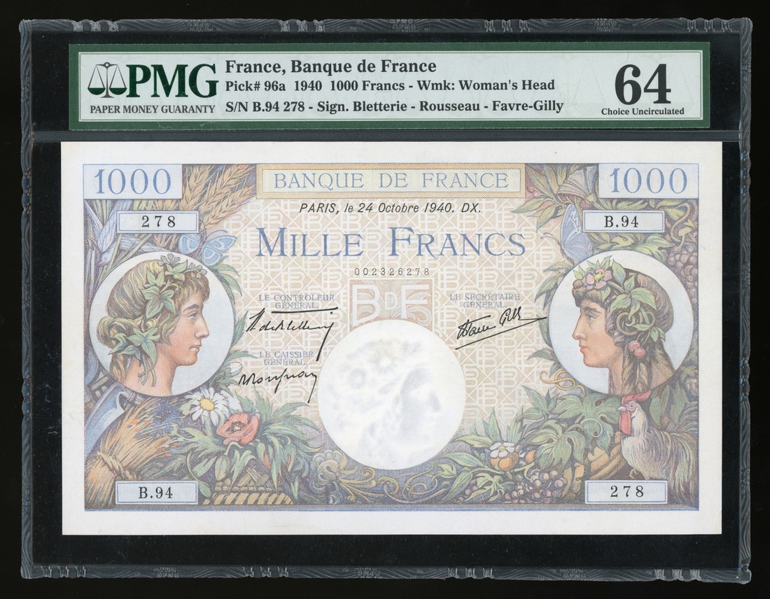 1940年法國1000法郎,編號B.94 278,PMG 64