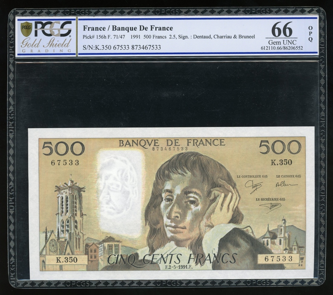 Banque De France, 500 francs, 1991, serial number K.350 67533 873467533, (Pick 156h), PCGS 66OPQ Gem Uncirculated