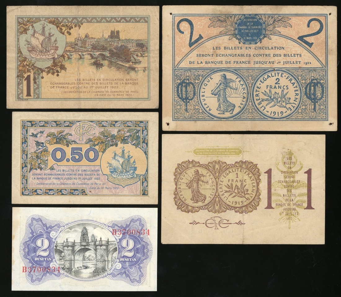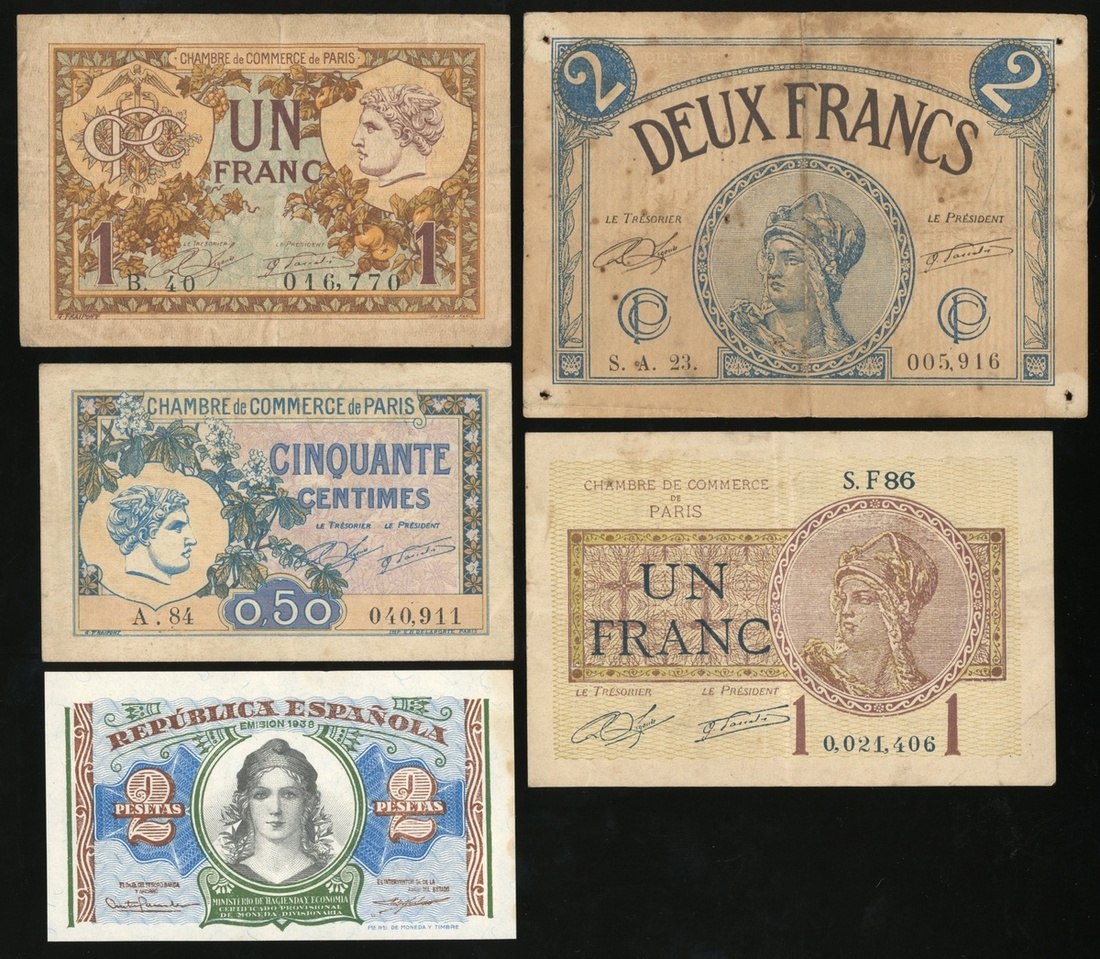 France and Spain, a group of 5 notes, consists of Chambre de Commerce De Paris, 0.5 franc, 2x 1 franc and 2 francs, and Spain, 2 pesetas, 1938, serial numbers A.84 040911, B10 016770, S.T.86 0021406, S.A. 23 005916 and B3700834, (various picks), extremely fine to about uncirculated (5).
