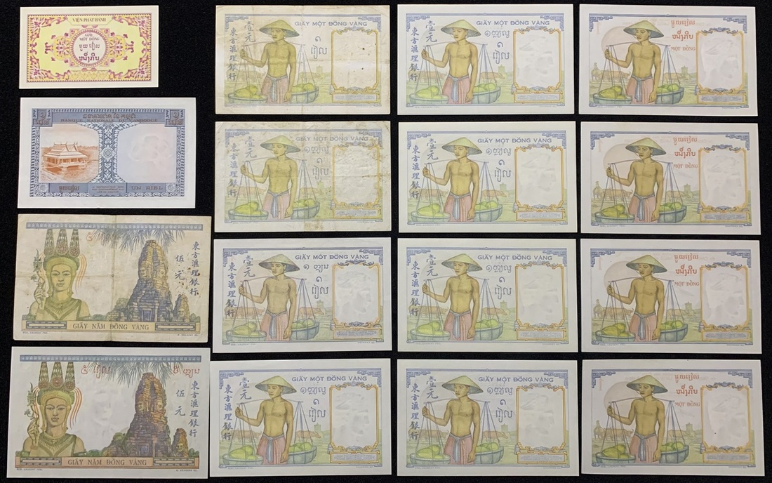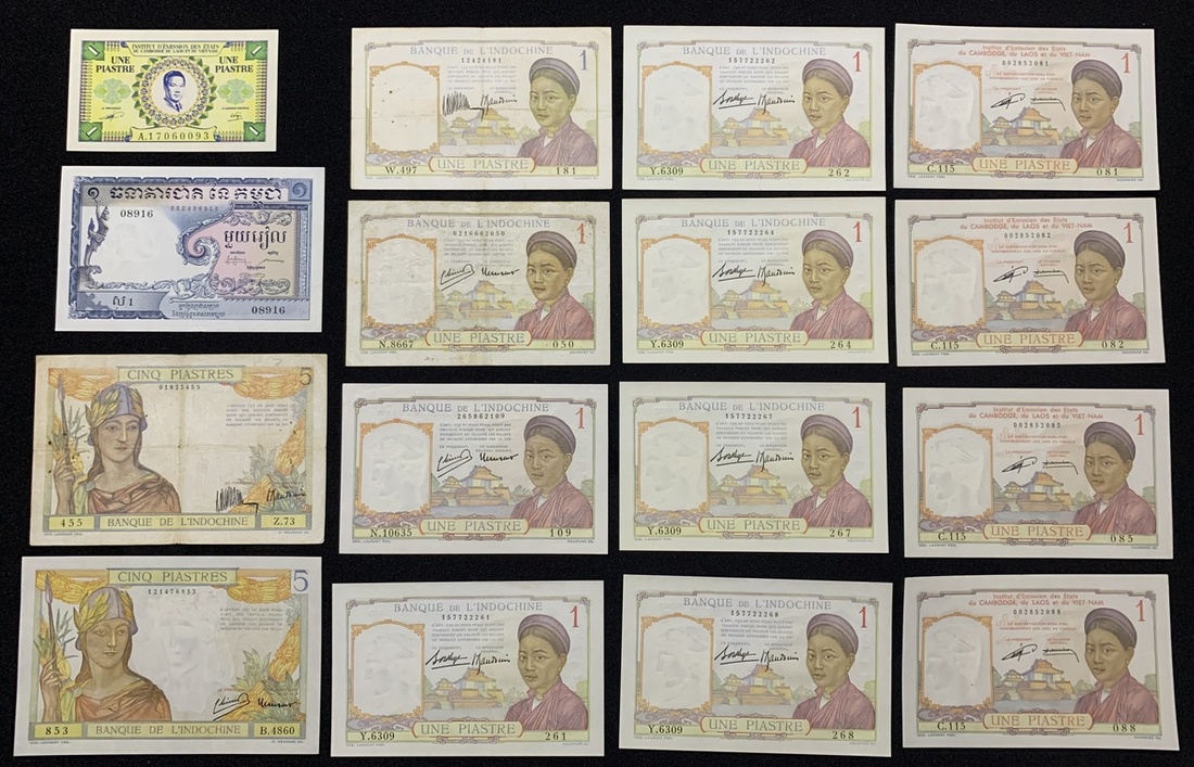 French Indo-China, a group of 16 notes, 1 piastre (13), 1 riel and 5 piastres (2), please refer to images for more information,