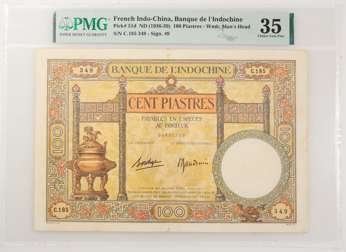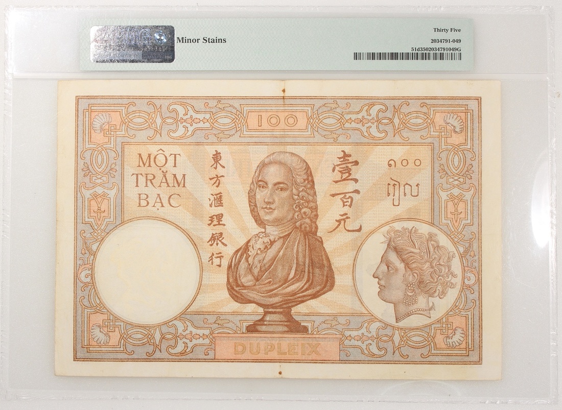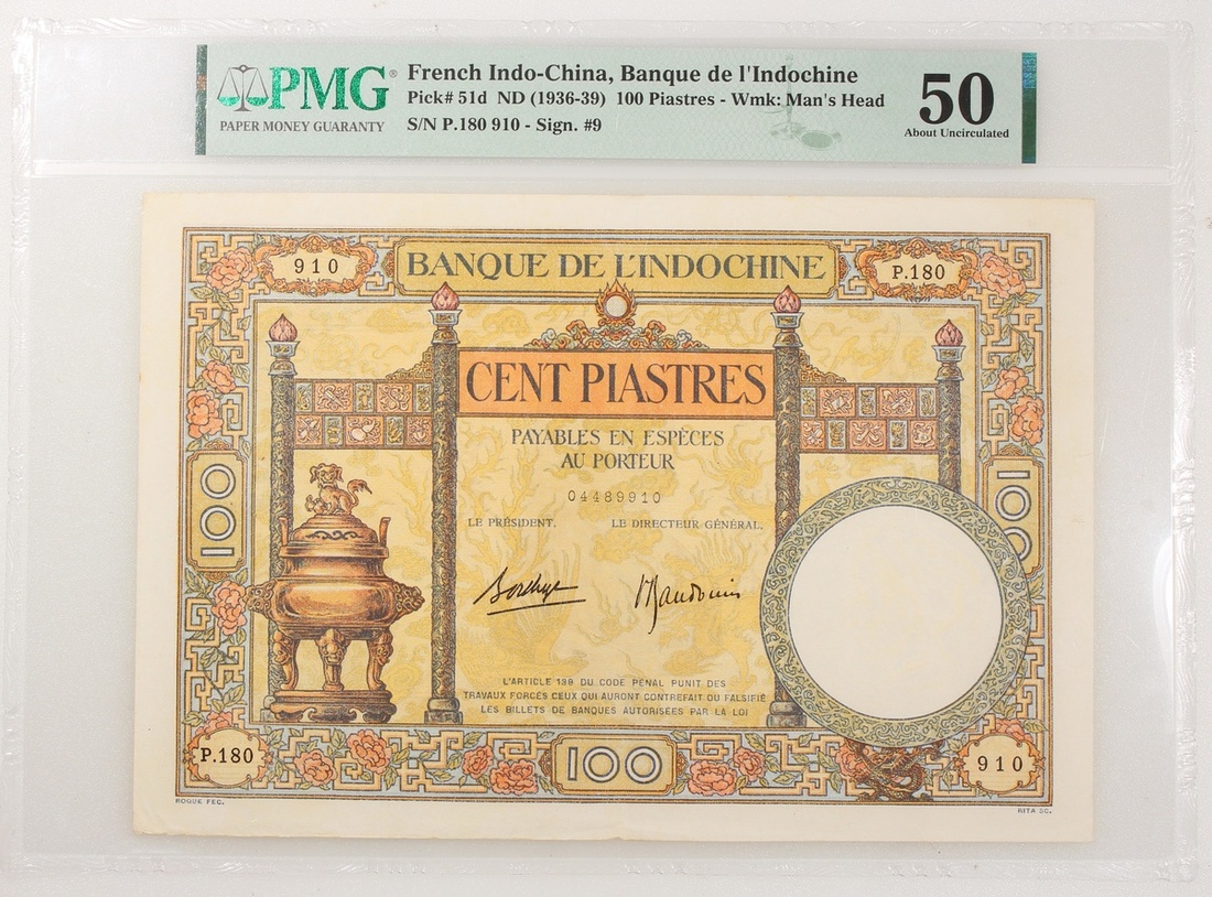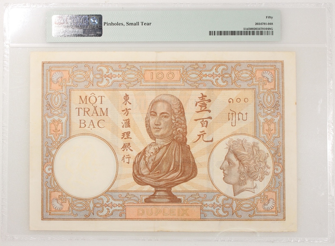 1936-39年法屬安南100元一對,無日期,編號P.180910 及 C.185349,PMG 50(有細孔及微裂),及35(輕微漬點)