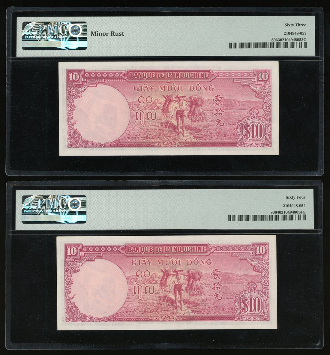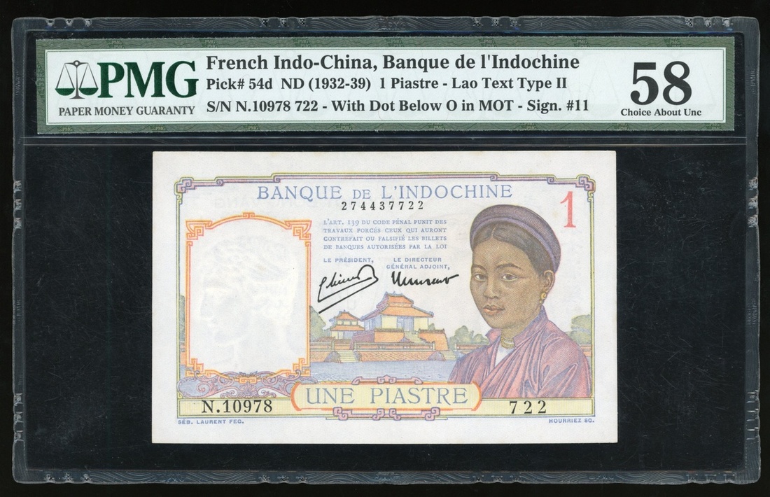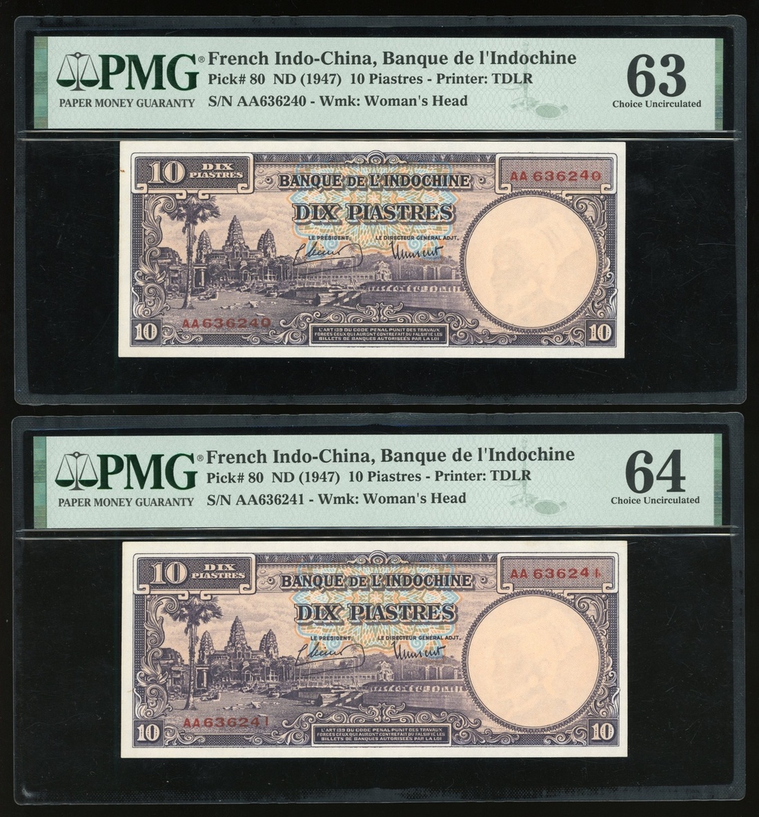 French Indo-China, a group of 3 notes, consists of 1 piastre, ND(1932-39), N. 10978 722, and a consecutive pair of 10 piastres, ND(1947), AA636240-41 (Pick 54d and 80), graded PMG 58, 63(Minor Rust) and 64 respectively (3).