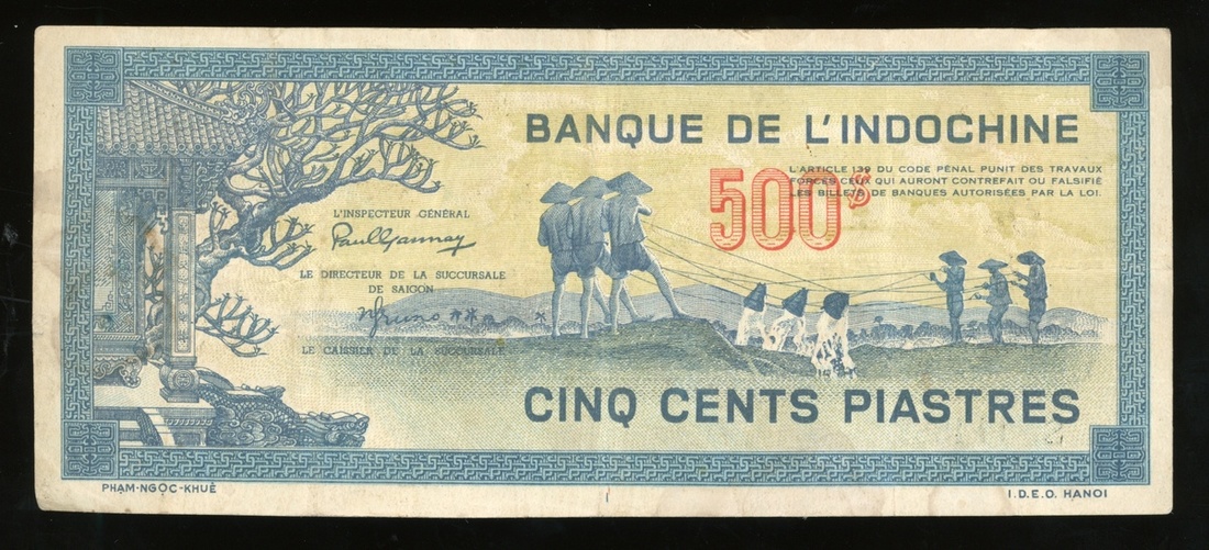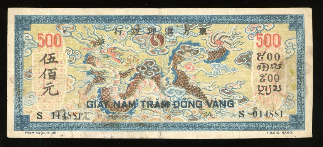 Banque de l'Indochine, French Indo-China, 500 piastres, ND (1944-1945), serial number S114881 S014881, blue on yellow,