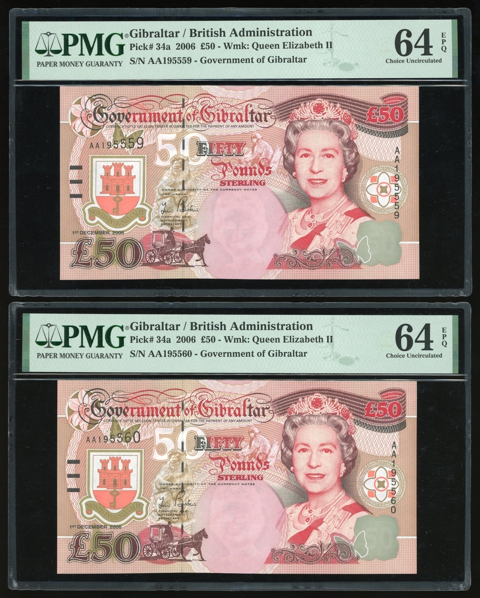Government of Gibraltar, British Administration, a consecutive group of 4x 50 pounds, 2006, serial numbers AA195559-562, (Pick 34a), all graded PMG 64EPQ Choice Uncirculated (4).