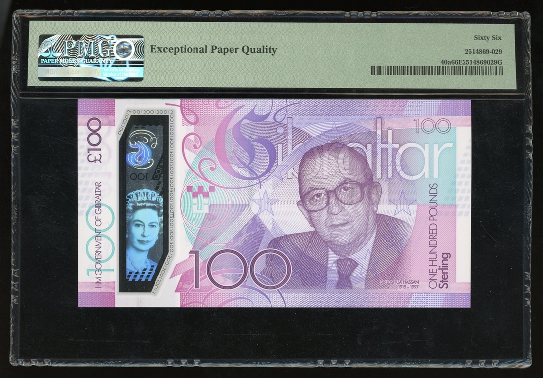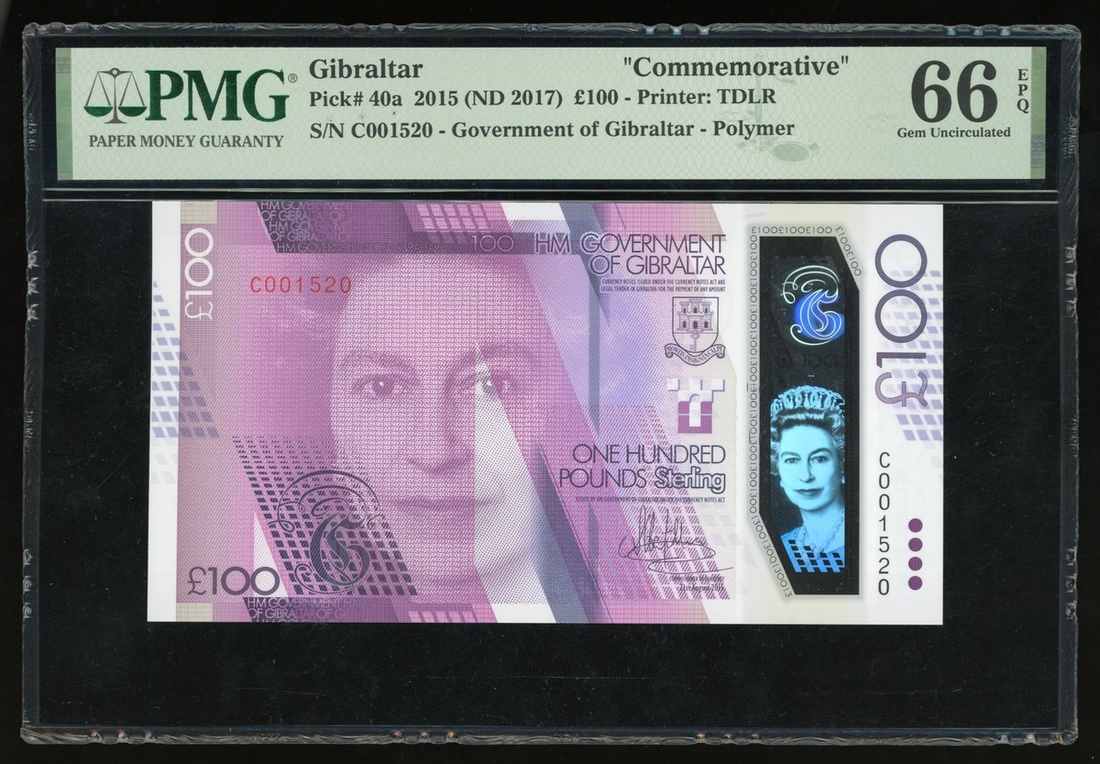 Government of Gibraltar, polymer £100, 2015, serial number C001520, (Pick 40a), low number, PMG 66EPQ Gem Uncirculated
