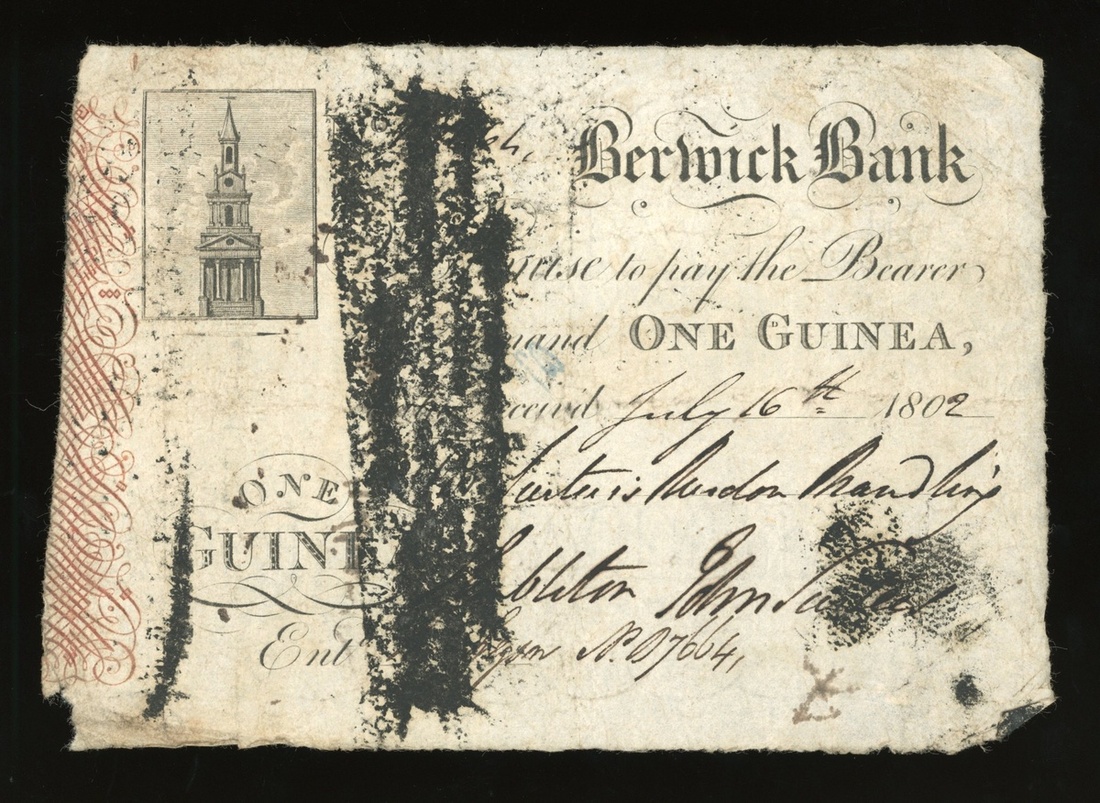 Berwick Bank, UK, 1 guinea, 1 October 1802, serial number 76641, ink, lower left corner missing tip, fine