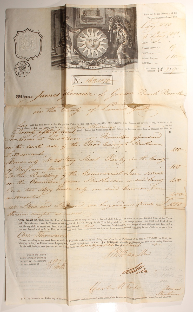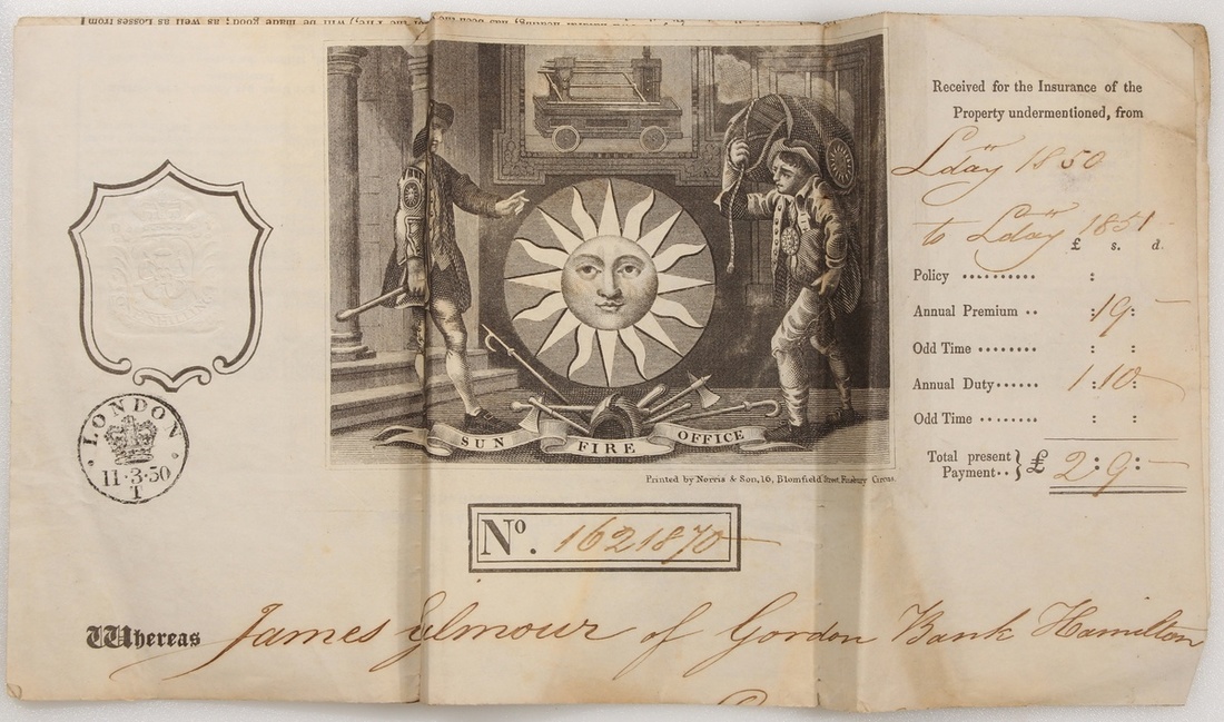Sun Fire Office, London, Great Britain, fire insurance policy with a total sum insured of 1000 pounds, dated 28th March 1850 to 28th March 1851, policy number 1621870, stamped with a chop of 1 shilling for stamp duty, the document featuring two of its firemen and a sun face with sixteen rays alternating straight and wavy in the emblem at top. The Sun Fire Office operated from 1710 until 1959, when it merged with the Alliance Assurance Company, which then merged with Royal Insurance to form the Royal & Sun Alliance Insurance Group in 1996. Very Fine with typical folding creases necessary for large documents