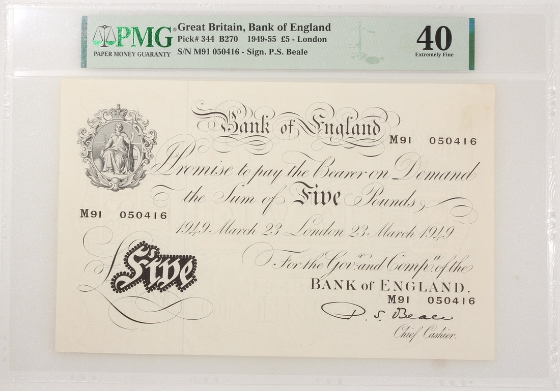 Bank of England, P.S. Beale, 5 pounds, London, 22 February 1952, serial number M91 050416, (Pick 344), PMG 40 Extremely Fine