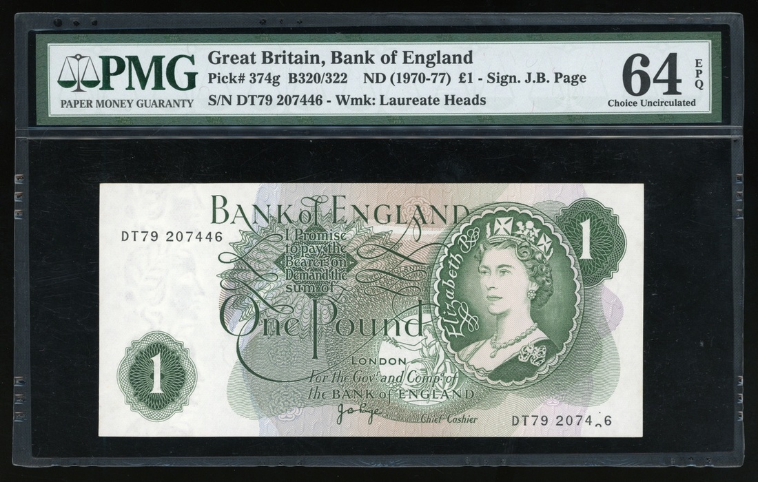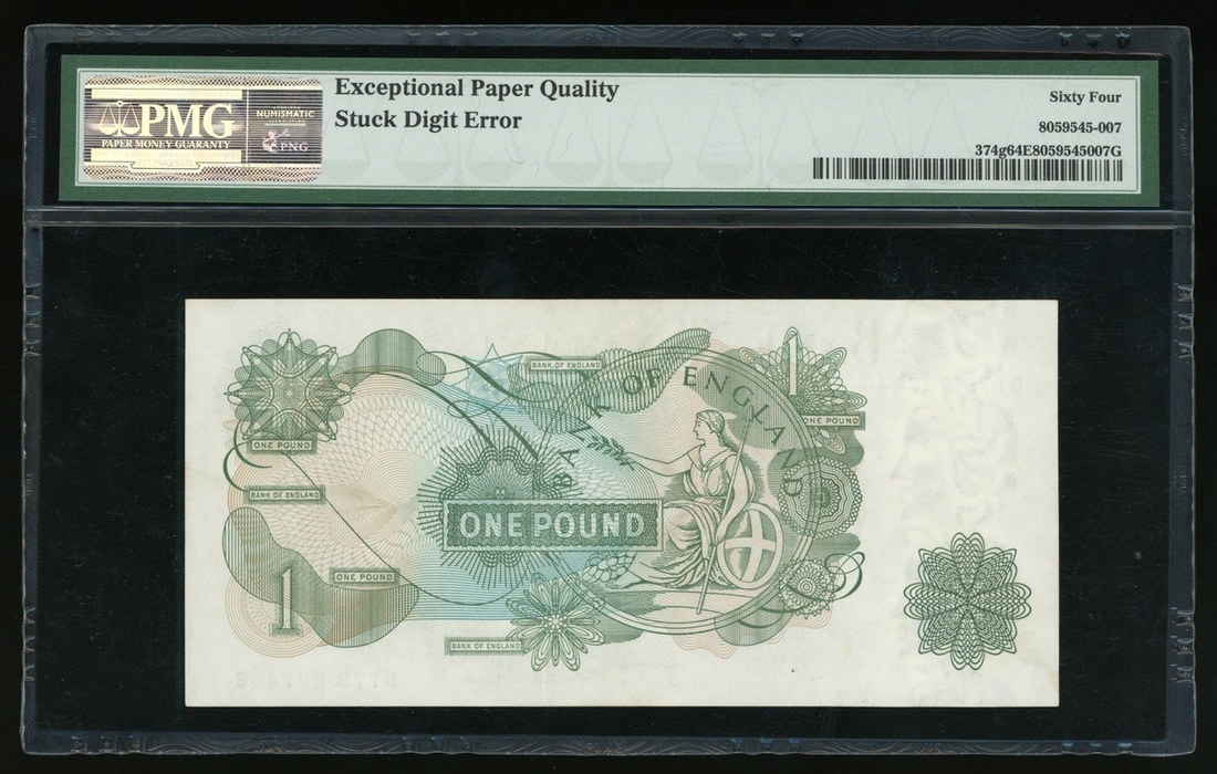 1970-77年英倫銀行1鎊編號印刷錯體票,編號 DT79 207446,PMG 64EPQ
