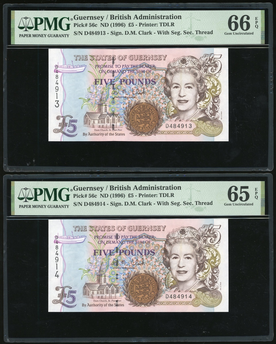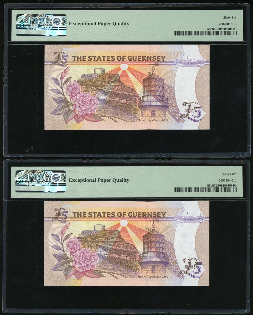 Guernsey, a consecutive pair of £5, ND(1996), serial number D484913-4, (Pick 56c), PMG 66EPQ and 65EPQ respectively.(2)