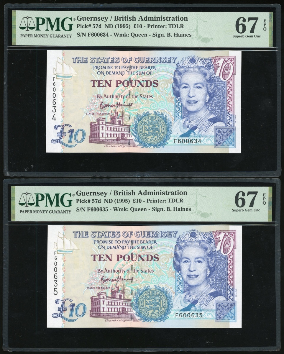 1995年耿西10鎊連號2枚,編號F600634-5,均PMG 67EPQ