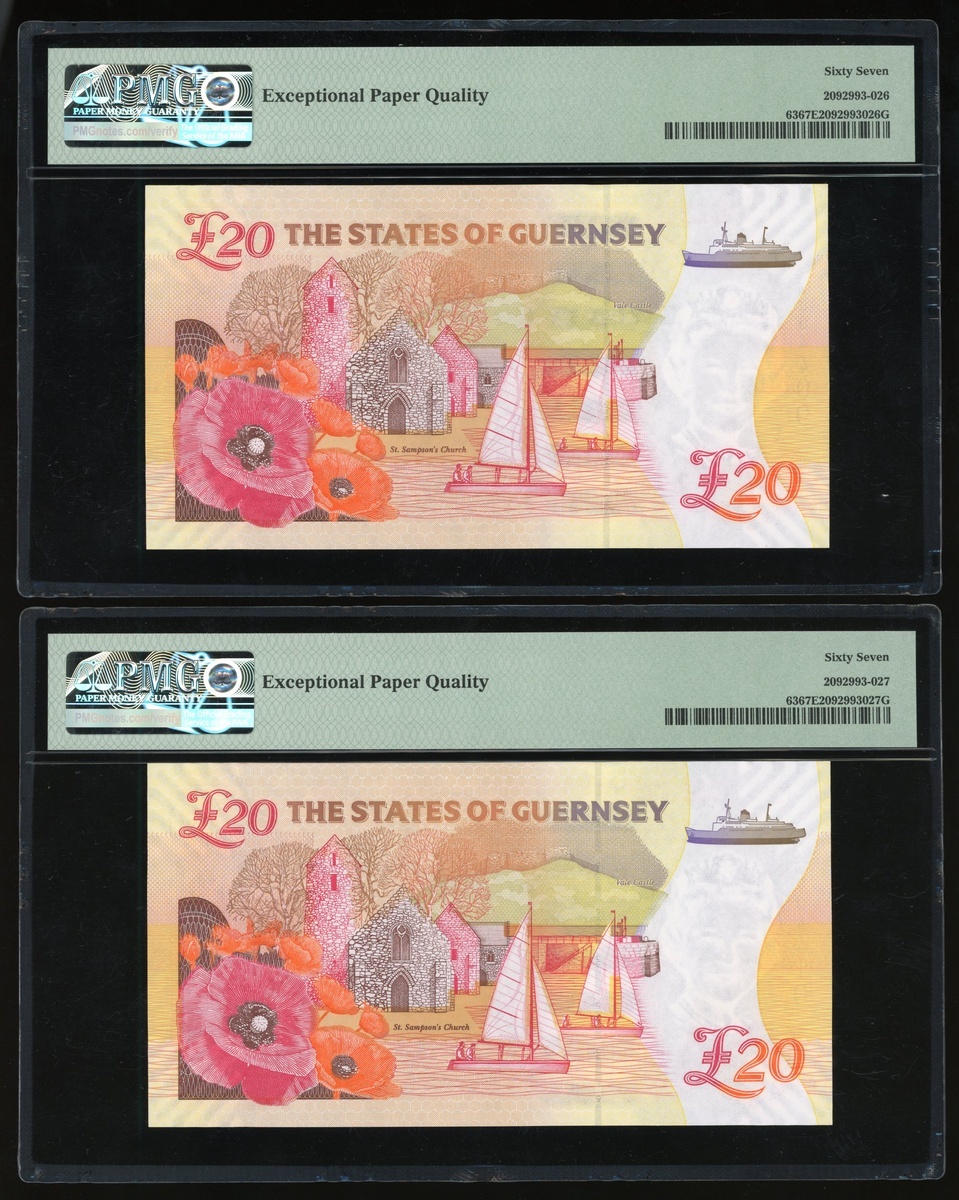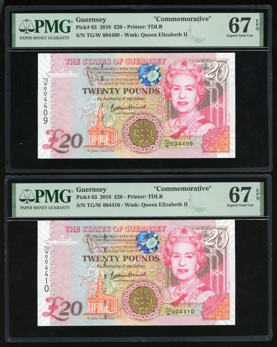 The States of Guernsey, a consecutive pair of 20 pounds, 2018, commemorative issue of The 100th Anniversary of The Great War (WWI 1918-2018), serial numbers TG/W 004409-10, (Pick 63), both graded PMG 67EPQ Superb Gem Uncirculated (2)