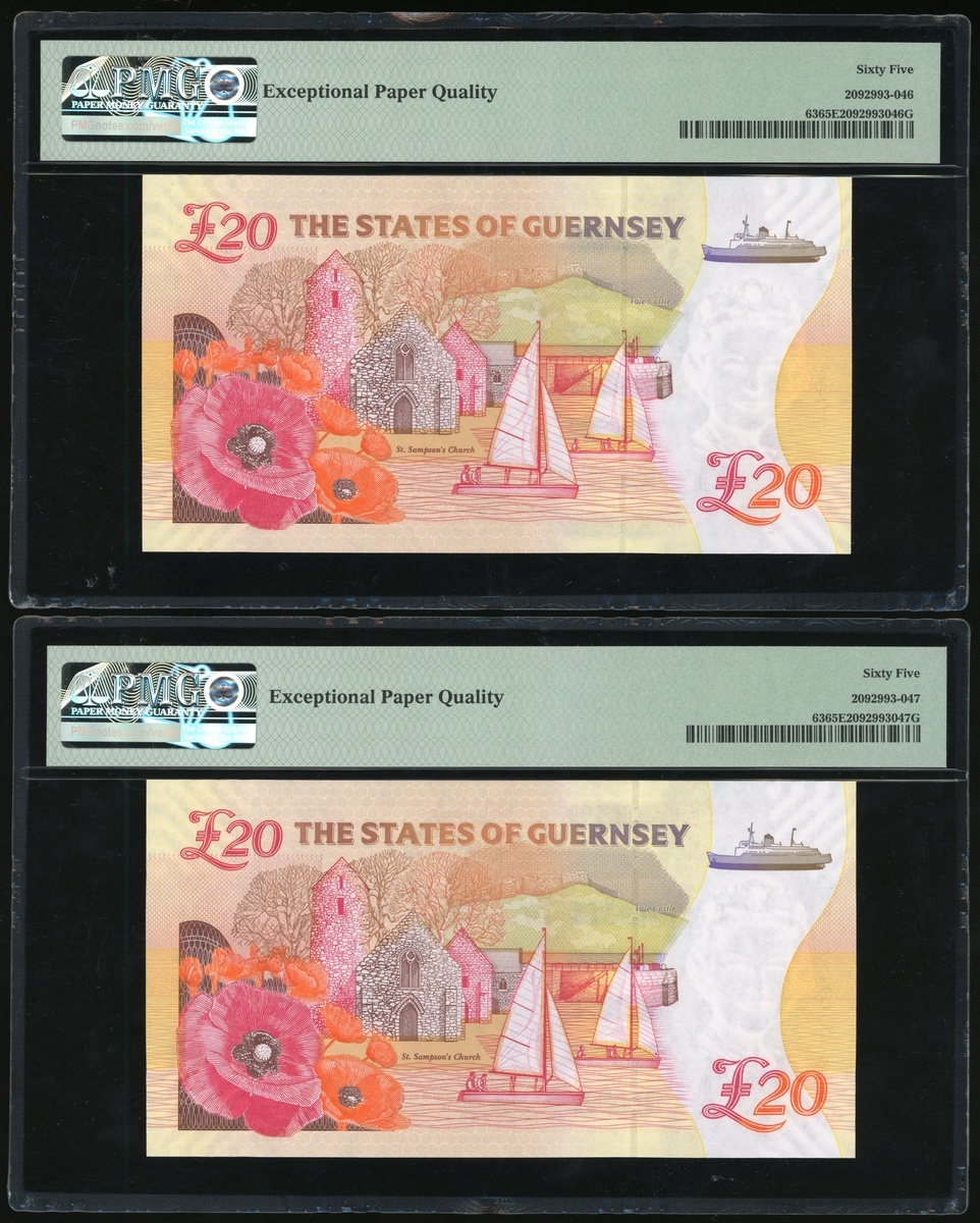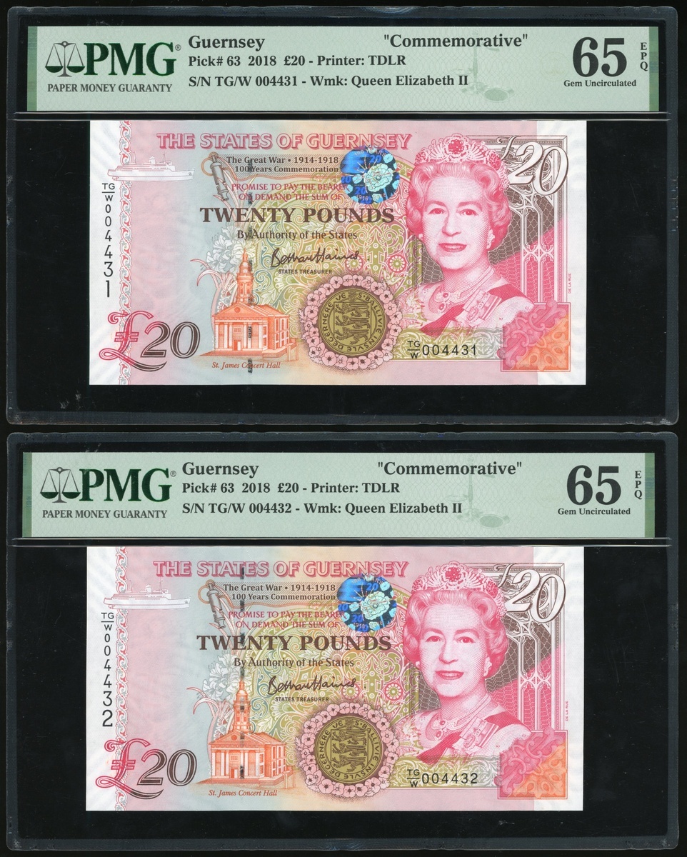 Guernsey, a consecutive pair of £20, 2018, 100 Years Commemorative of the Great War, serial number TG/W004341-2, red and multicolour underprint, Elizabeth II at right, arms at bottom centre,