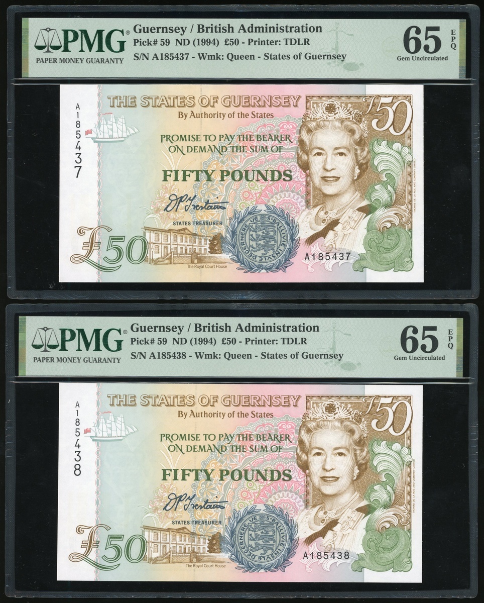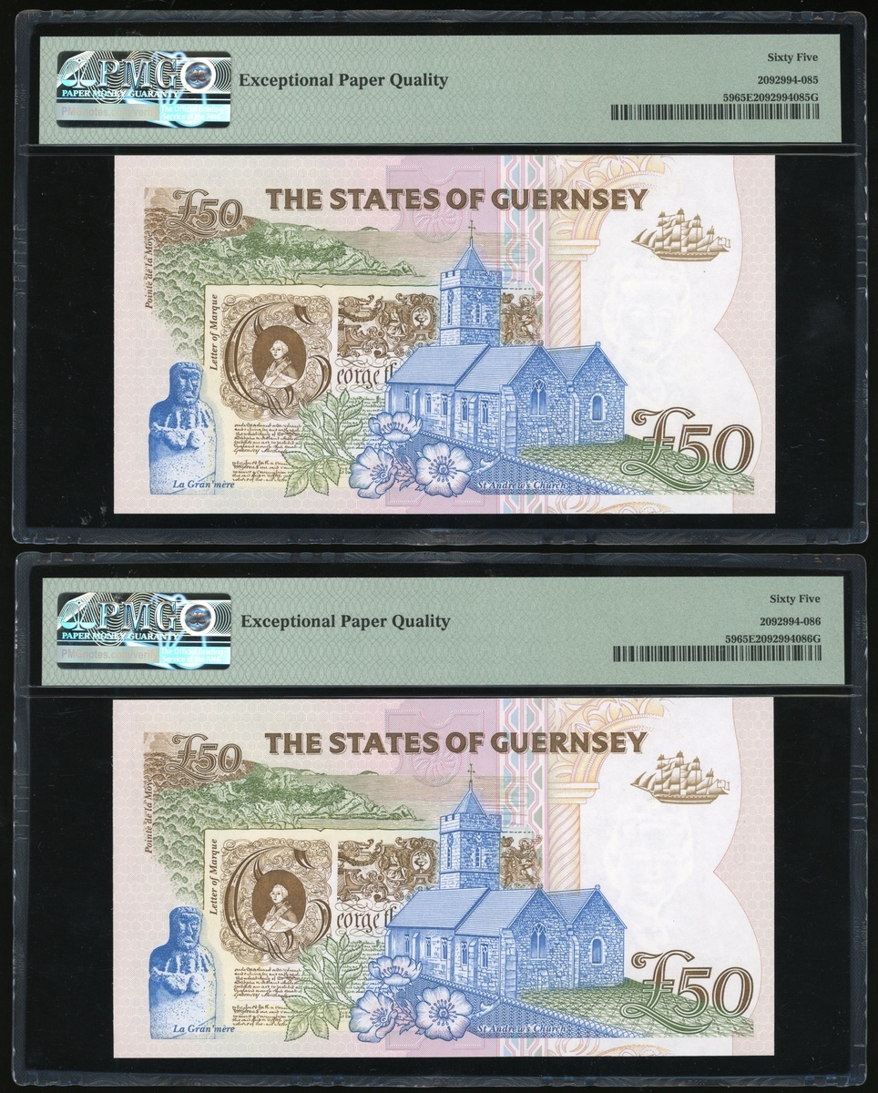 Guernsey, a consecutive pair of £50, serial number A185437-8, multicolour, Elizabeth II at right, arms at bottom centre,