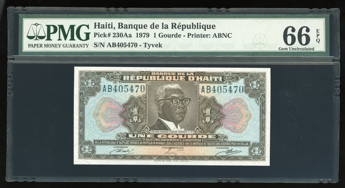 Banque de la Republique d'Haiti, tyvek 1 gourde, 1979, serial number AB405470, (Pick 230Aa), PMG 66EPQ Gem Uncirculated