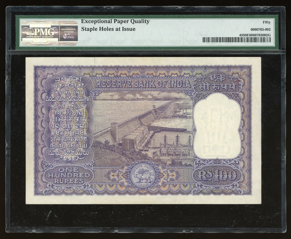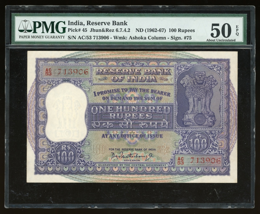 1962-67年印度100盧比,編號 AC53 713906,PMG 50EPQ