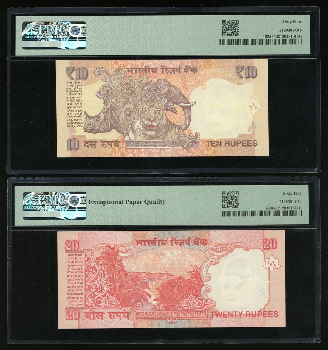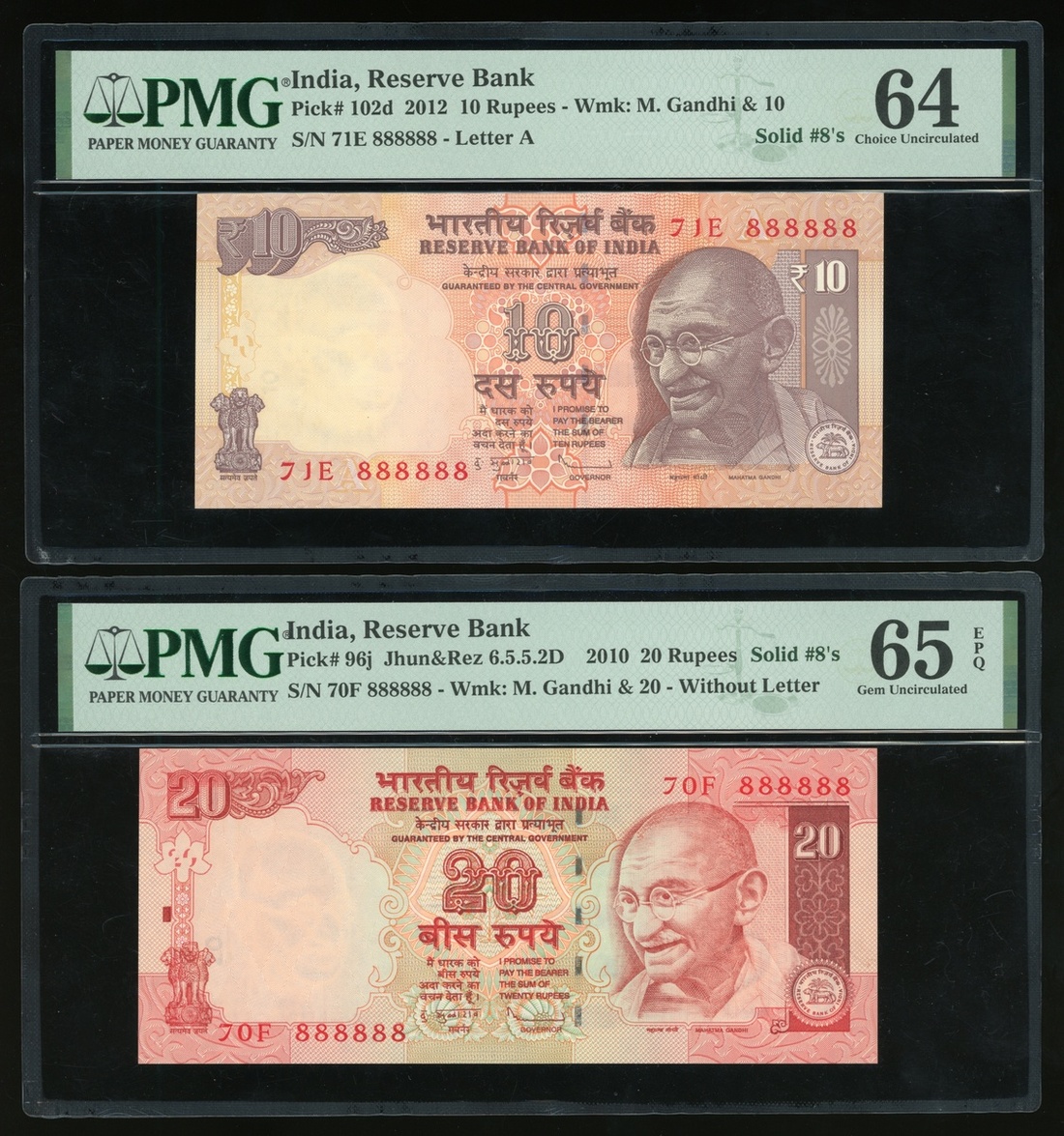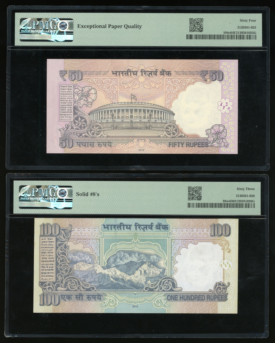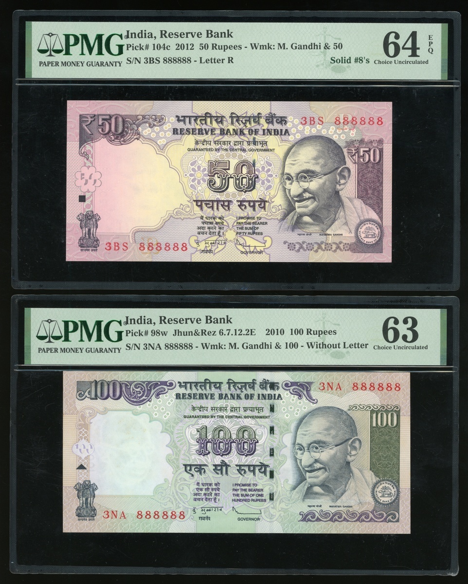 Reserve Bank of India, a group of 4 notes, consists of 10, 20, 50 and 100 rupees, 2010 and 2012, different prefix identical solid number 71E 888888, 70F 888888, 3BS 888888 and 3NA 888888, (Pick 102d, 96j, 104c and 98w), graded PMG 64, 65EPQ, 64EPQ and 63 respectively (4).