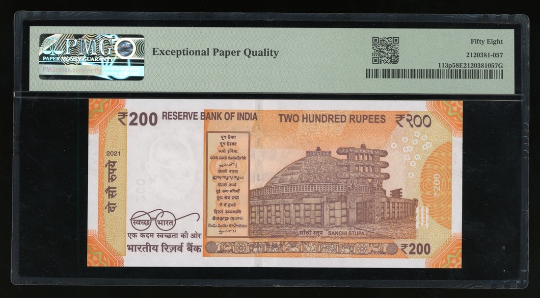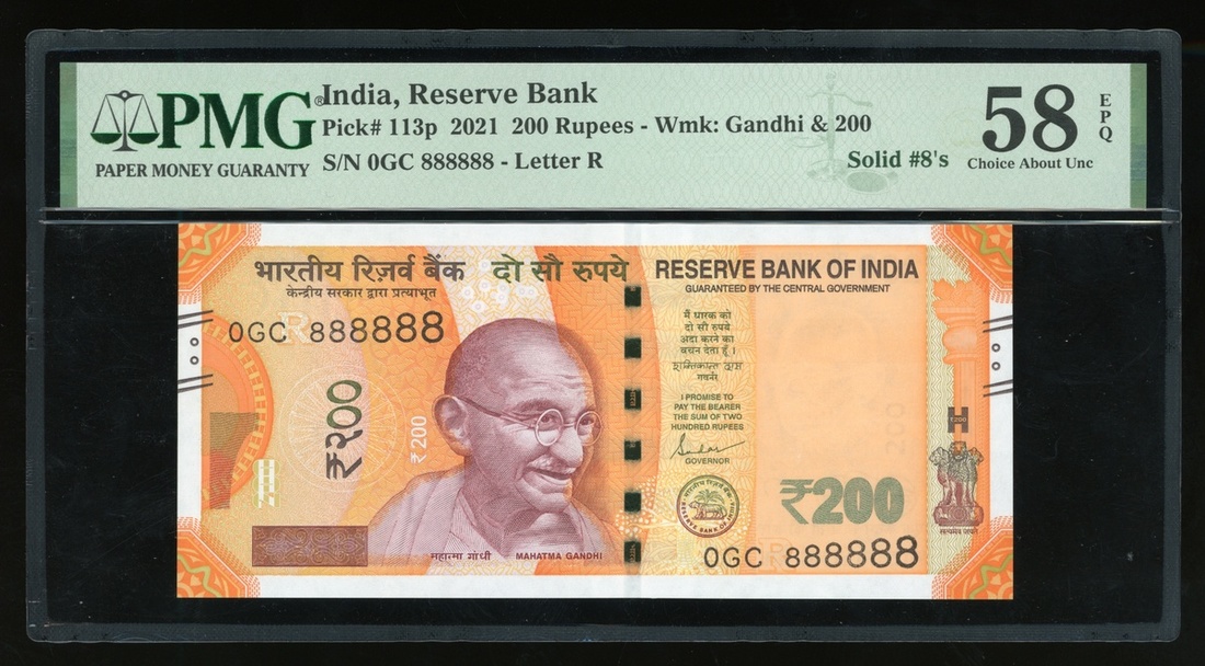 Reserve Bank of India, 200 rupees, 2021, solid serial number 0GC 888888, letter R, (Pick 113p), PMG 58EPQ Choice About Uncirculated.