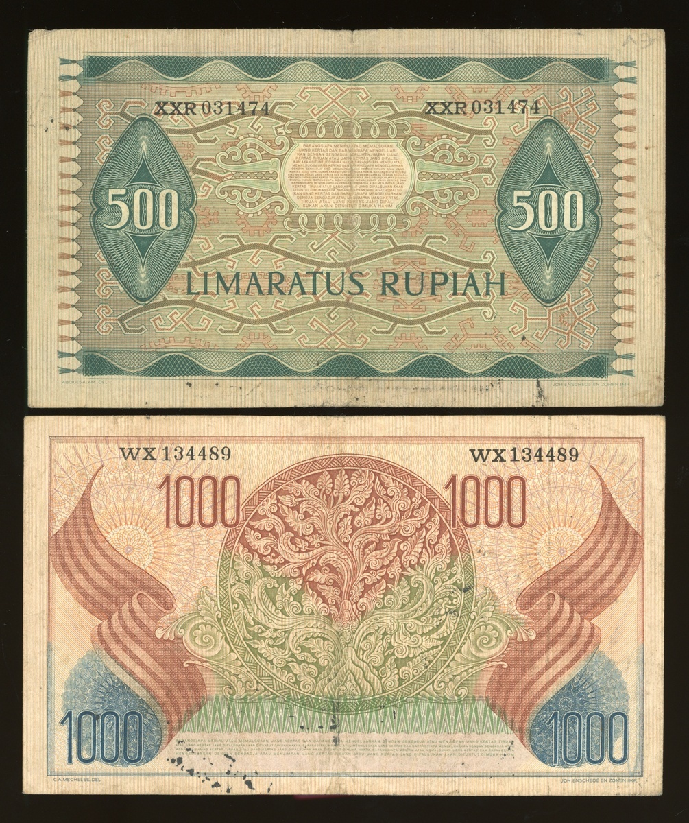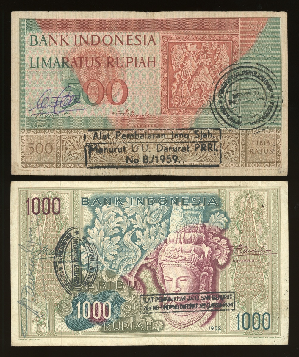 Bank Indonesia, a pair of 500 and 1000 rupiah "Rebellion overprint", the 1000 rupiah with original sign, (Pick 47 and 48), very fine (2).